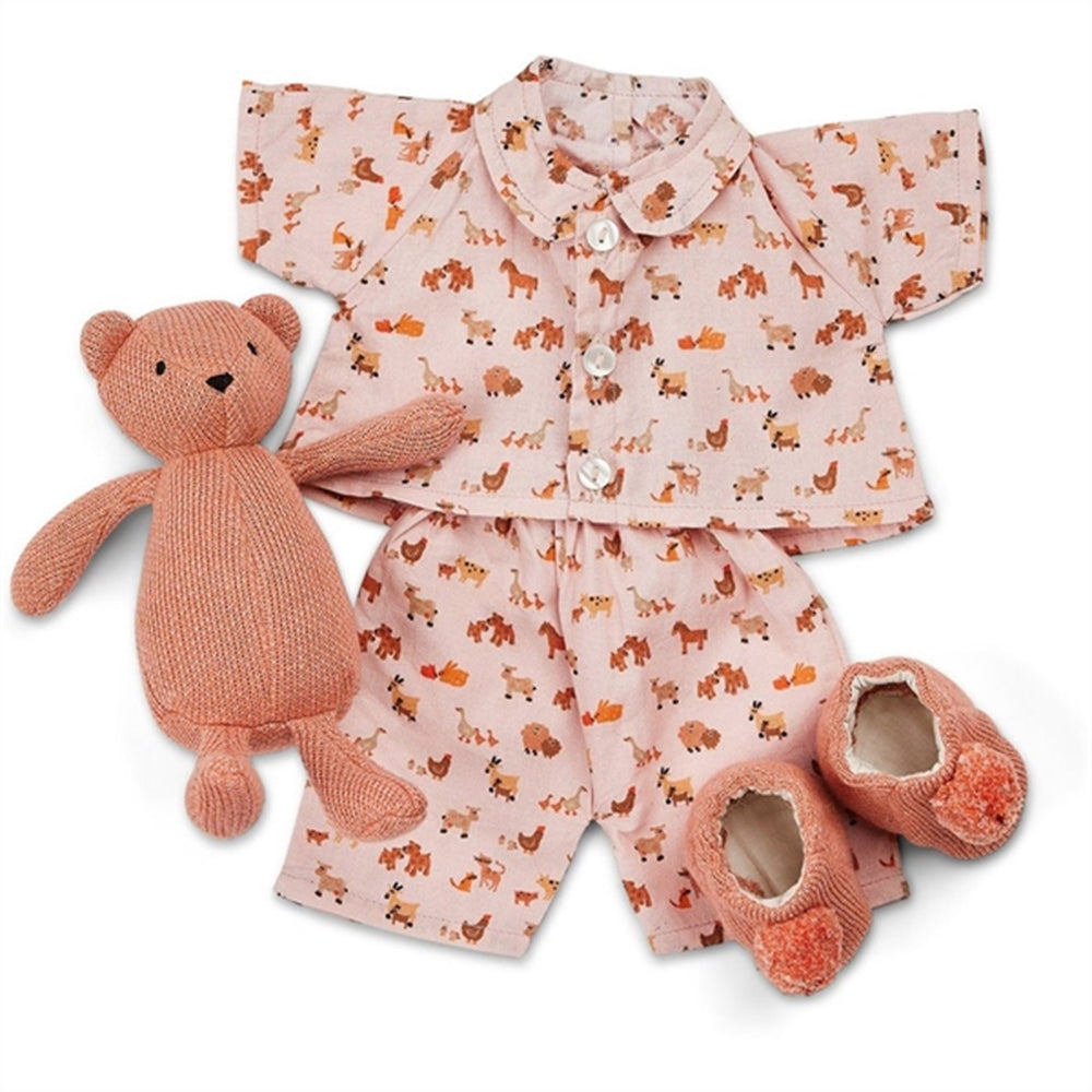 Woven pajamas with small farm animals, including a knitted sleeping teddy bear and slippers