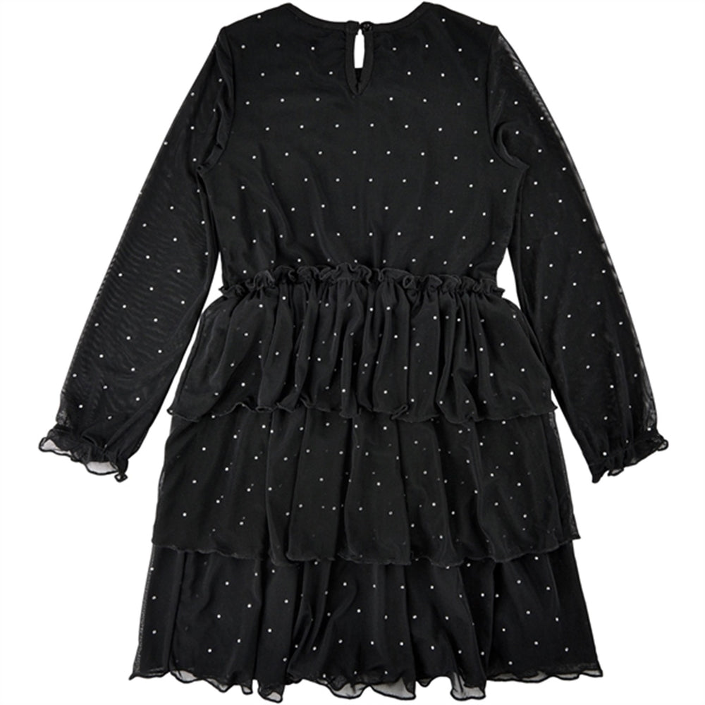 Glamourous long-sleeve mesh dress from THE NEW with a sophisticated and fashionable look. This black frill dress is double layered (except for the sleeves). The inside fabric is solid, soft and breathable, while the outside fabric is thin, transparent mesh covered in clear rhinestones. It is a sparkling and enchanting piece for your girl to dress up for Christmas, New Years Eve and other celebrations. - Mini dress with long, transparent sleeves and round neckline.- Triple frill mesh skirt for a voluminous and elegant look. - Adorned with clear rhinestones glued all over.- A thin elastic creates nice frill detail and fit around the wrists. - Slit with elasticated loop closing in the back of the neck. - The inside fabric is made in 95% silky soft viscose with 5% elastane. - The outside fabric is made in 95% polyester with 5% elastane (mesh).