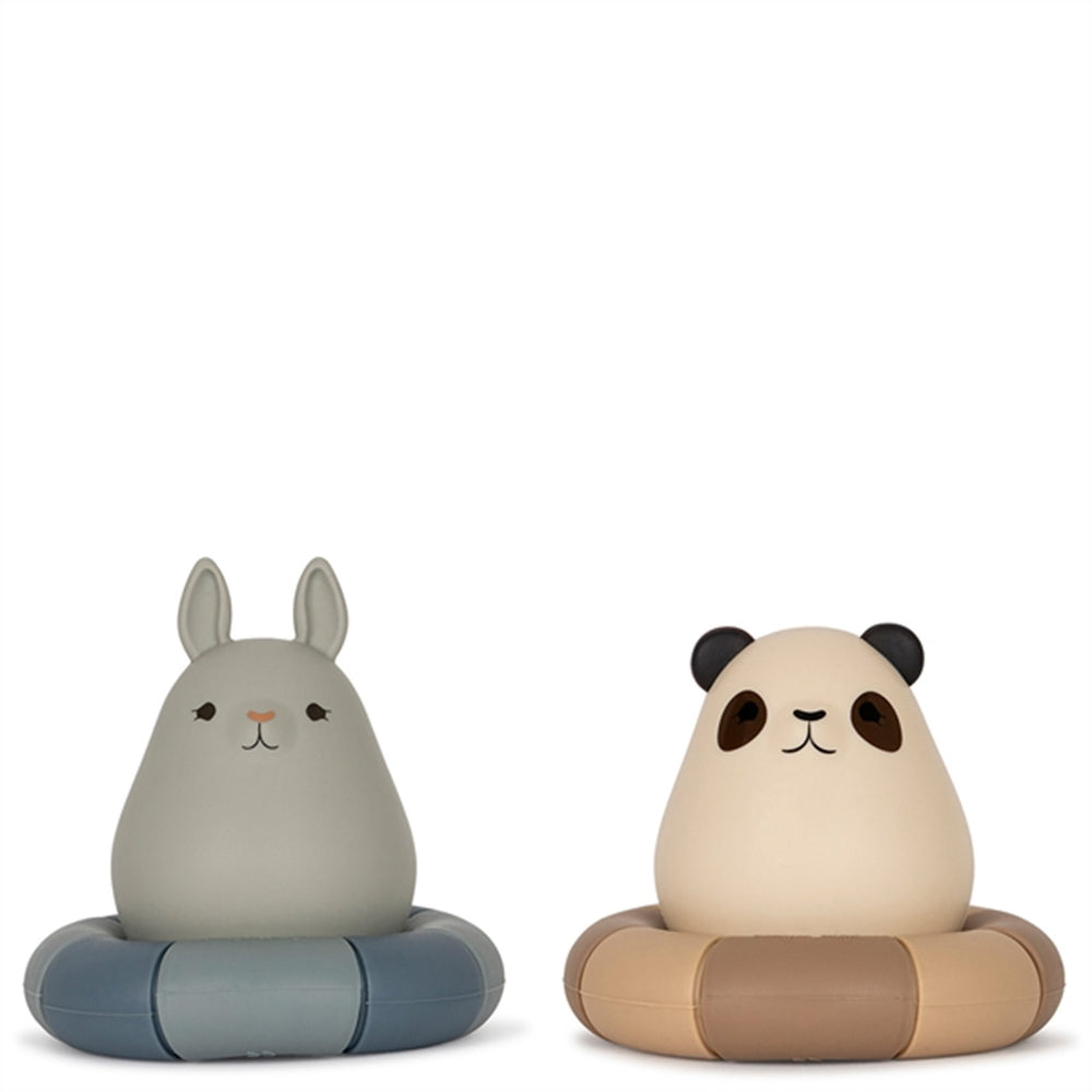 Bath toys made from 100% siliconeRabbit: D: 5,4 cm x H: 8 cm Panda: D: 5 cm x H: 6,5 cmSwing: D: 8,4 cm x H: 2 cm12m +