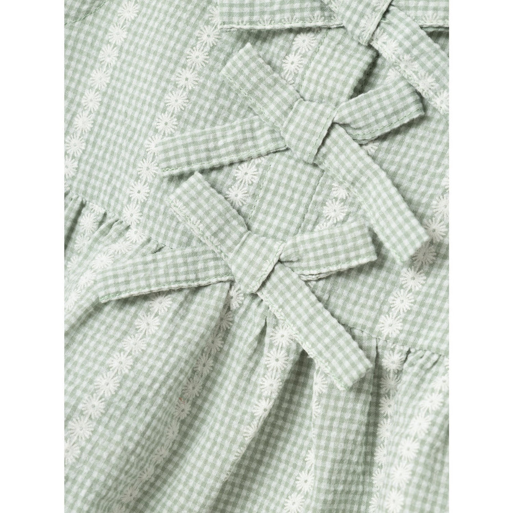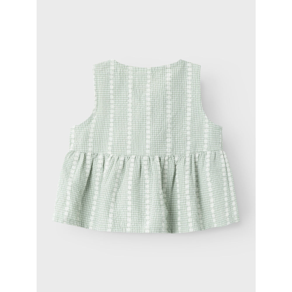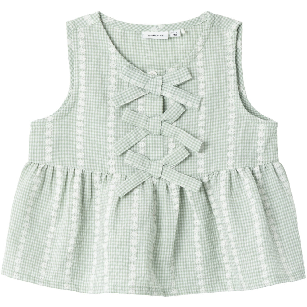 Get your child ready for the summer sun and fun with the Name It Silt Green Hicheck Blouse! This airy blouse is perfect for everyday and party, with its simple cross pattern and light texture. The blouse has a cute bow detail, sleeveless design and closes with buttons. Made of 54% cotton and 46% polyester. Your little one will look cute and feel comfortable all day!