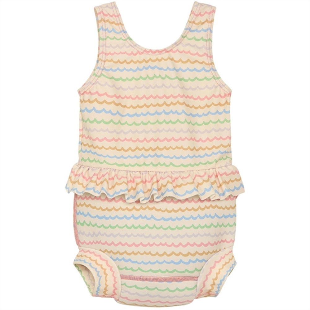 Diaper swimsuit with wide shoulder straps and frills at the waist. The swimsuit has a UV50+/UPF50 filter. This product is certified with Oeko-Tex 100®.