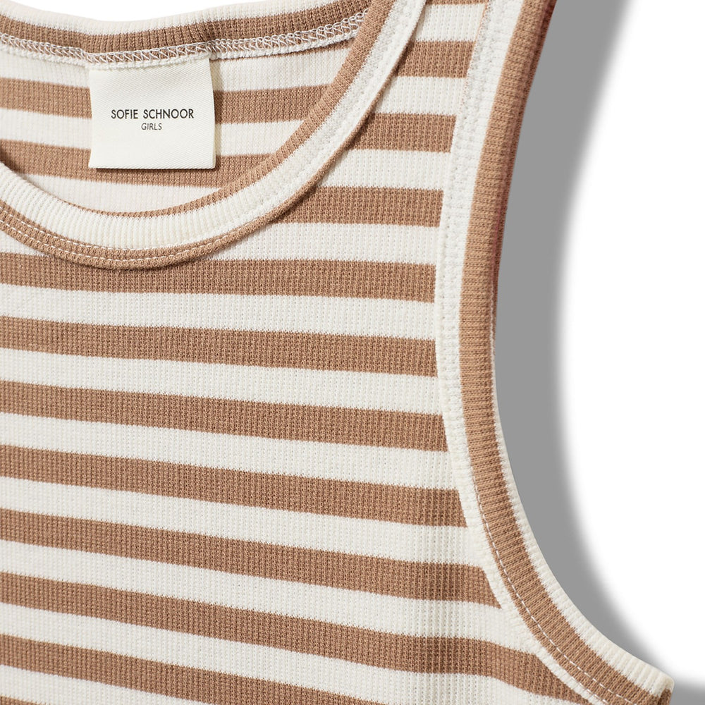 Super cool midi dress in cashew brown stripes from Sofie Schnoor. It is designed to give a tight-fitting and trendy style with a slit on the left side.