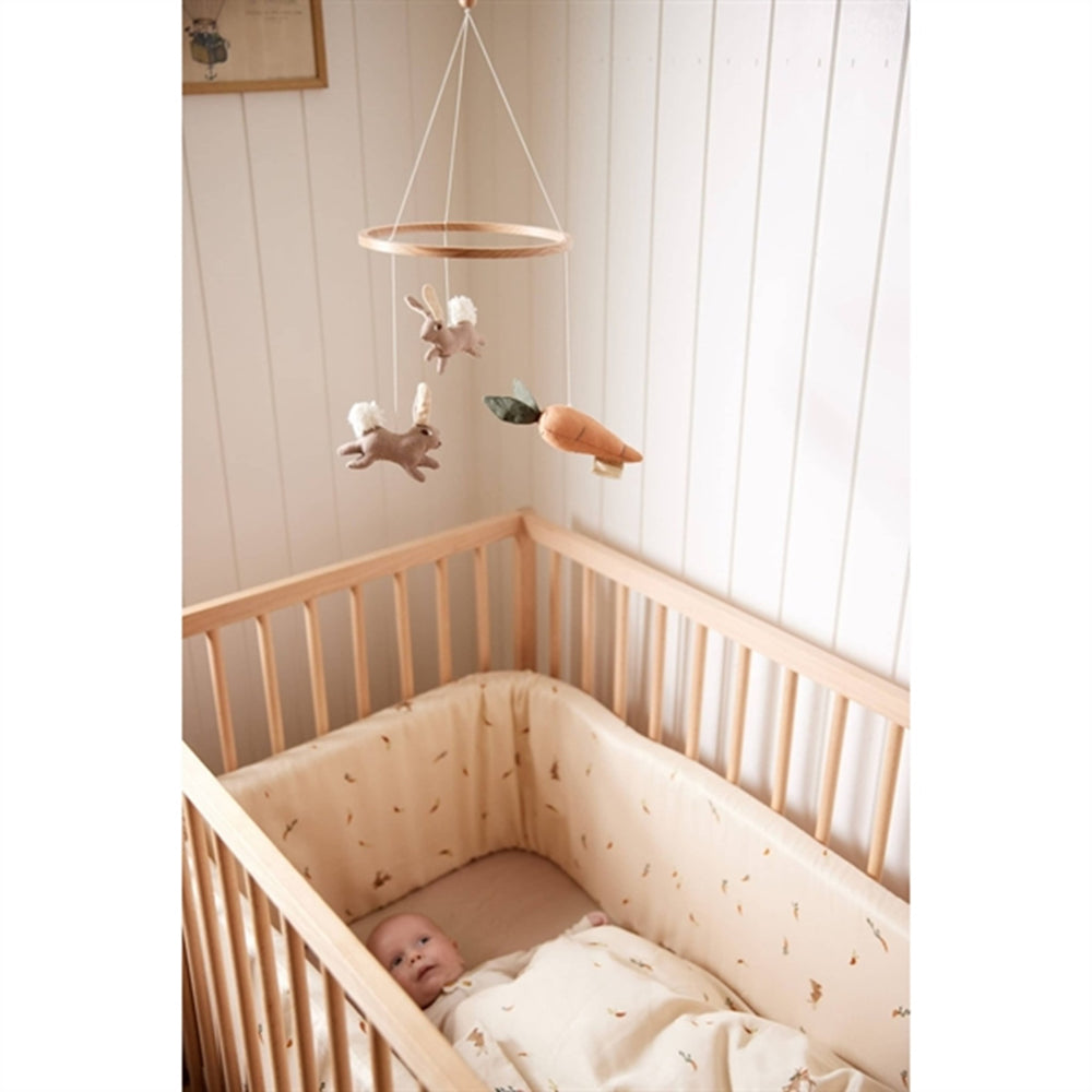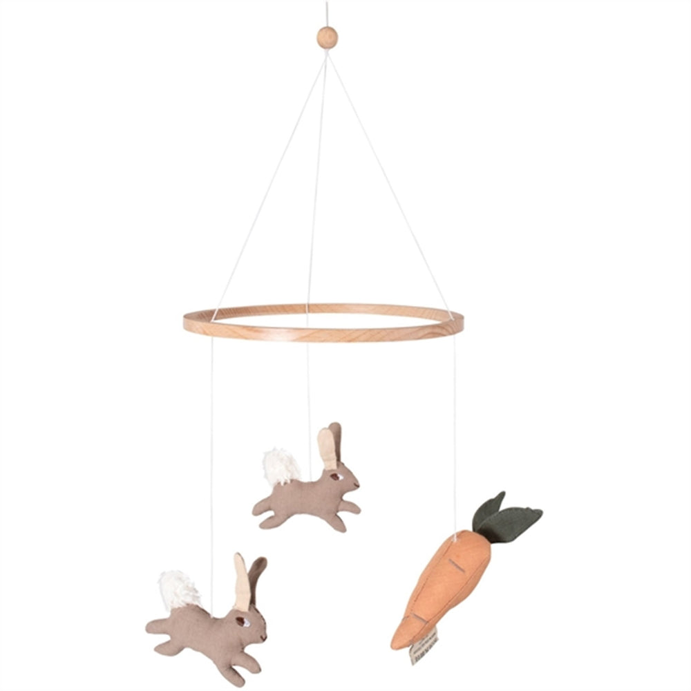 The sweet mobile is made of linen fabric and consists of a beech wood ring with two cheeky bunnies and a delicious carrot.