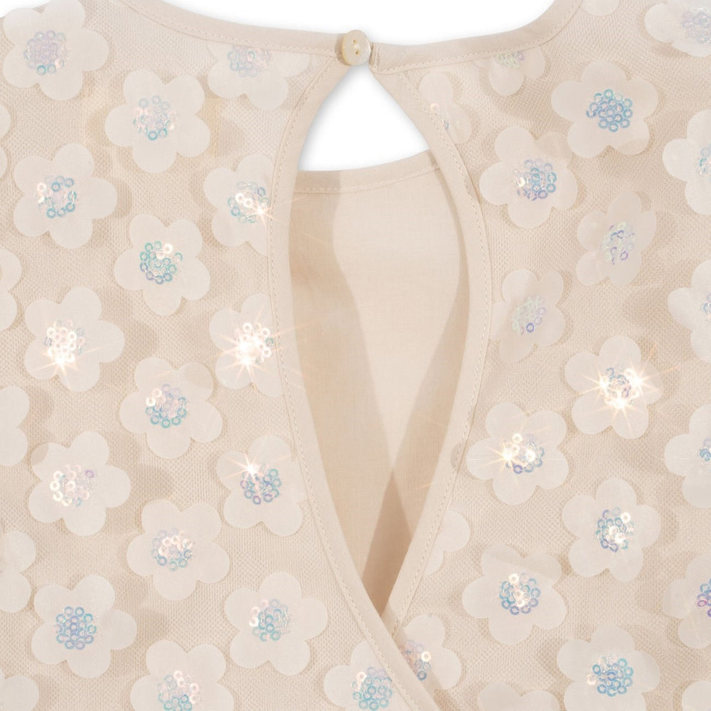 Layered dress with puffy sleeves and sequin attachments. Made from 100% polyester with a 100% cotton lining