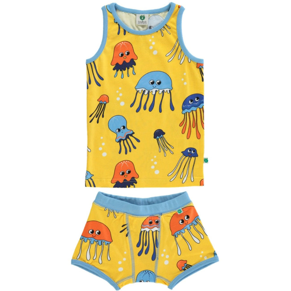 Underwear set with jellyfish, produced in an organic and stretchable cotton jersey. This set is OEKO-TEX Standard 100® certified, which means that the underwear is produced and tested for harmful substances, so you can take care of your child's skin and health. The set consists of an upper without sleeves with ribbing neckline and armhole, and a pair of ribbed underpants with elastic at the waist. The underwear set has a normal fit. Småfolk's underwear is designed in Denmark with the idea of being able to withstand countless adventures and play, and maintain shape and colors even after repeated use. The model in the picture is 110 cm tall and has size 4-5 years on. Jellyfish can show up in all shapes and sizes. In this print, we go deep into the ocean and see jellyfish illuminate the water. The dark background of the print allows the elements to appear brighter and makes for a fun exploration into the depth of colors and shades, and a play with the placement of elements and their outlines. Småfolk's prints are drawn with a focus on happy colours, details and stories. Our underwear sets are a great way to add personality to your child's wardrobe while allowing your child to feel comfortable all day and night.