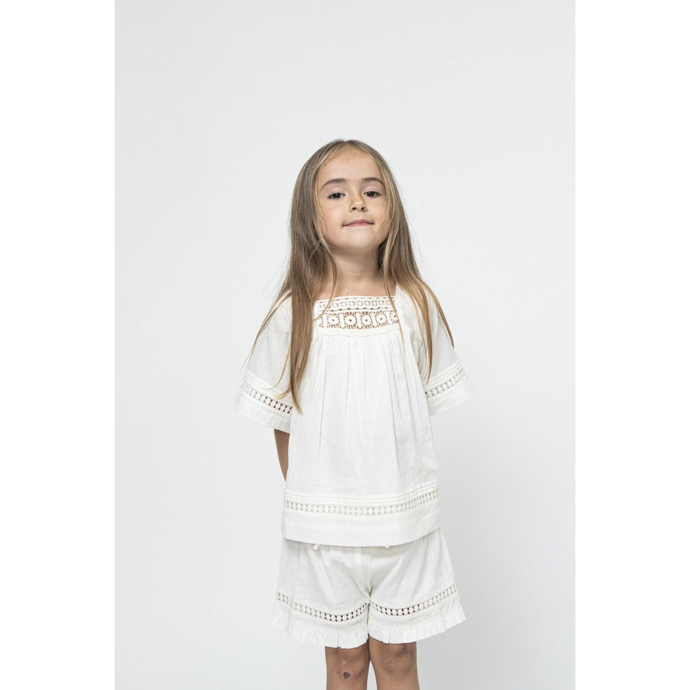 Soft and comfortable t-shirt in antique white with Sofie Schnoor's signature style. This nice T-shirt has short large sleeves and beautiful details. Perfect for play and fun! Made of 100% soft cotton. Suitable for machine washing – remember to follow the washing and instruction manual to maintain quality. Get your little one ready to score style points with this gorgeous T-shirt from Luksusbaby.