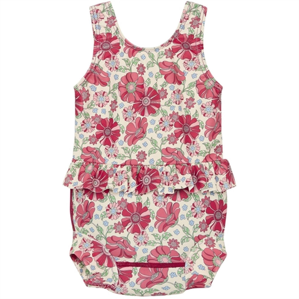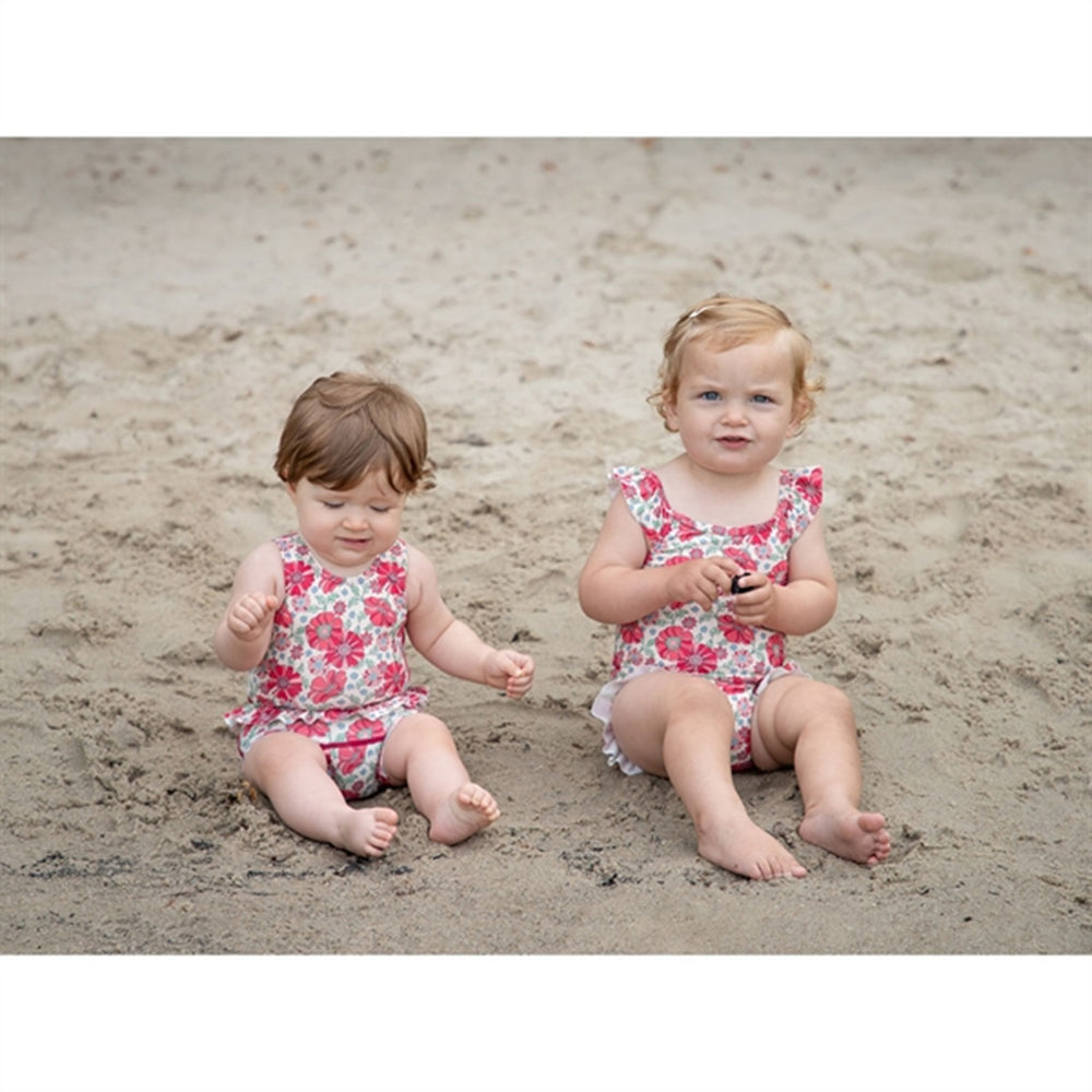 The diaper bathing suit has wide shoulder straps and ruffles at the waist. The swimsuit has a UV50+/UPF50 filter. This product is certified with Oeko-Tex 100®.