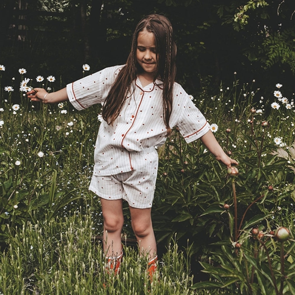 Shirt with printed ladybugs and glitter stripes.Small piping at edges.Heart shaped buttons at front.Fit perfect with Kia shirt.
