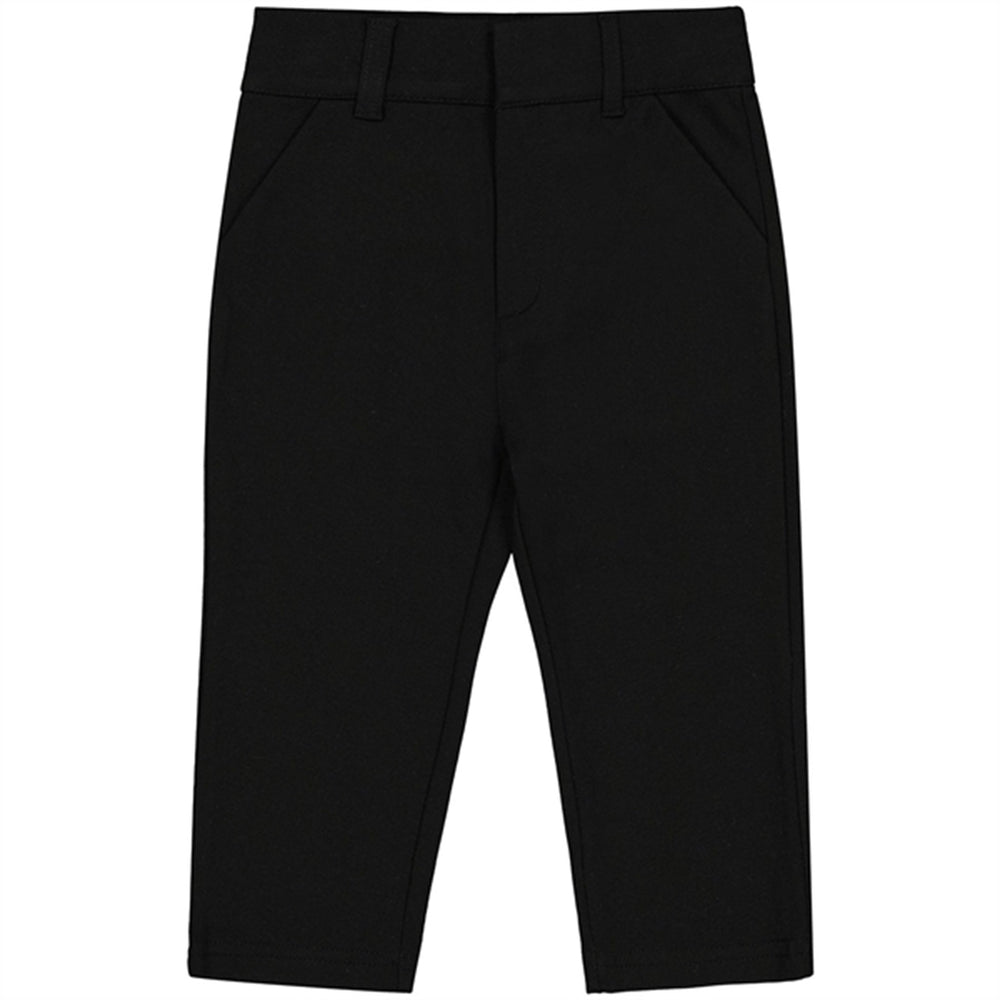 Stylish black stretch pants from THE NEW siblings for little boys. These lightweight, soft, and highly stretchable trousers are made of viscose and polyester, ensuring high breathability and freedom of movement. The design resembles suit trousers, which makes them perfect for parties and celebrations, such as New Year's Eve. Pair them with the elegant TNSIbro shirt or bodysuit for a charming party outfit for the little boy.- Tapered fit with ample room for the diaper.- Adjustable elastic inside the waistband lets you find the right fit.- Slanted front pockets and decorative back pockets.- Belt loops, zipper, and hook closure.- 68% viscose makes the trousers lightweight and breathable, 28% polyester enhances durability, and 7% elastane provides stretchability.