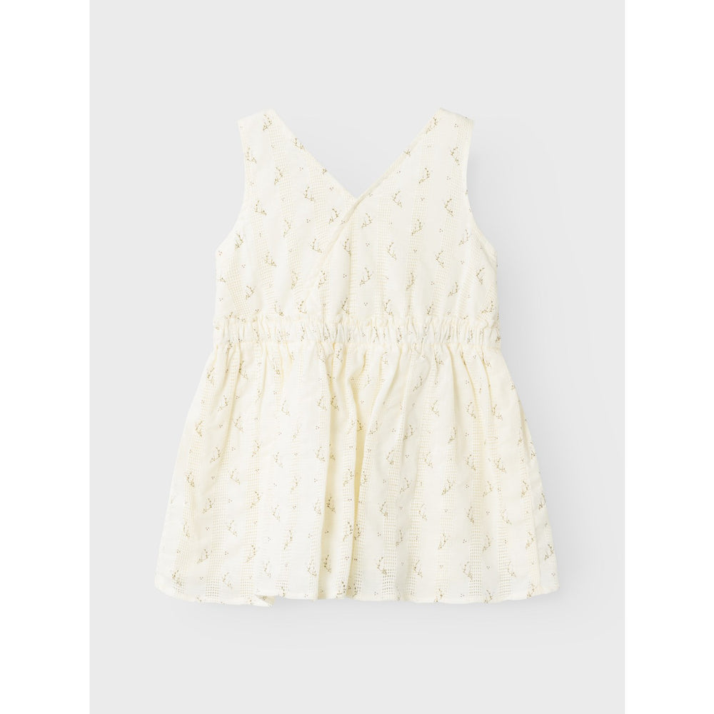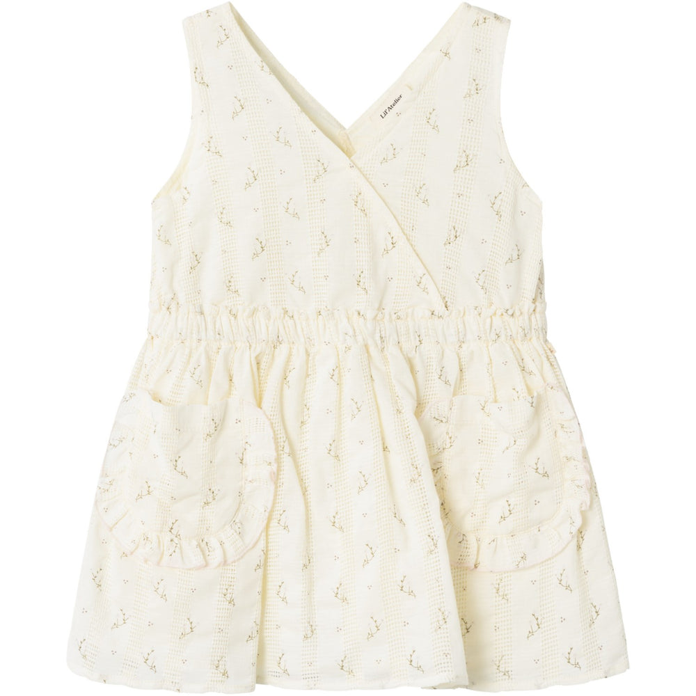 Refresh your kid's closet with the Lil'Atelier Coconut Milk Jinna Skirtall - a playful and versatile addition for any season. Made from organic cotton, this dress features a charming criss-cross pattern and front pockets for a touch of fun. With a V-neck and sleeveless design, it's perfect for staying stylish and comfy all day. Let your little one shine in this dress, made with care for both them and the environment.