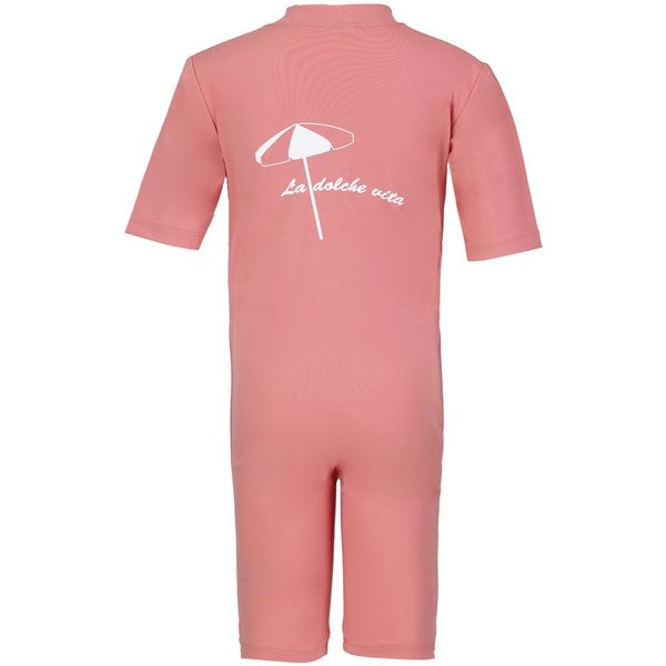 UV suit with short legs/sleeves, YKK zipper and La Dolce Vita print on the back. Made of 75% recycled material and is made in a quick-drying material.