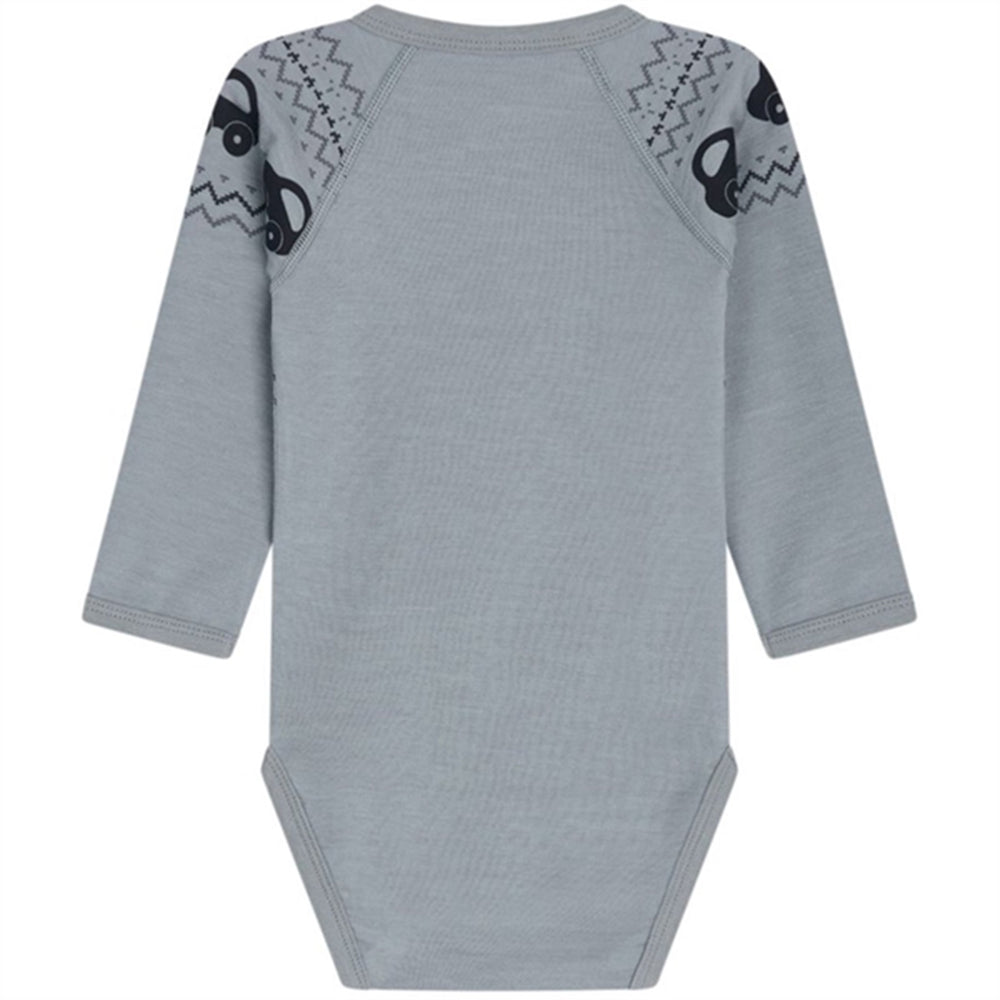 Long-sleeved bodysuit in soft stretch wool and bamboo viscose. Some with prints of rabbits or cars. Buttons on the left shoulder and between the legs. Wool on the outside and viscose from bamboo on the inside. This garment is Oeko-Tex 100® certified.