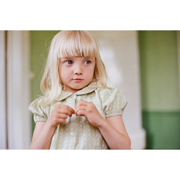 Stella short-sleeved dress is made of organic cotton. Featuring a Peter Pan collar, a gathered yoke, front button closure, and puffy sleeves.