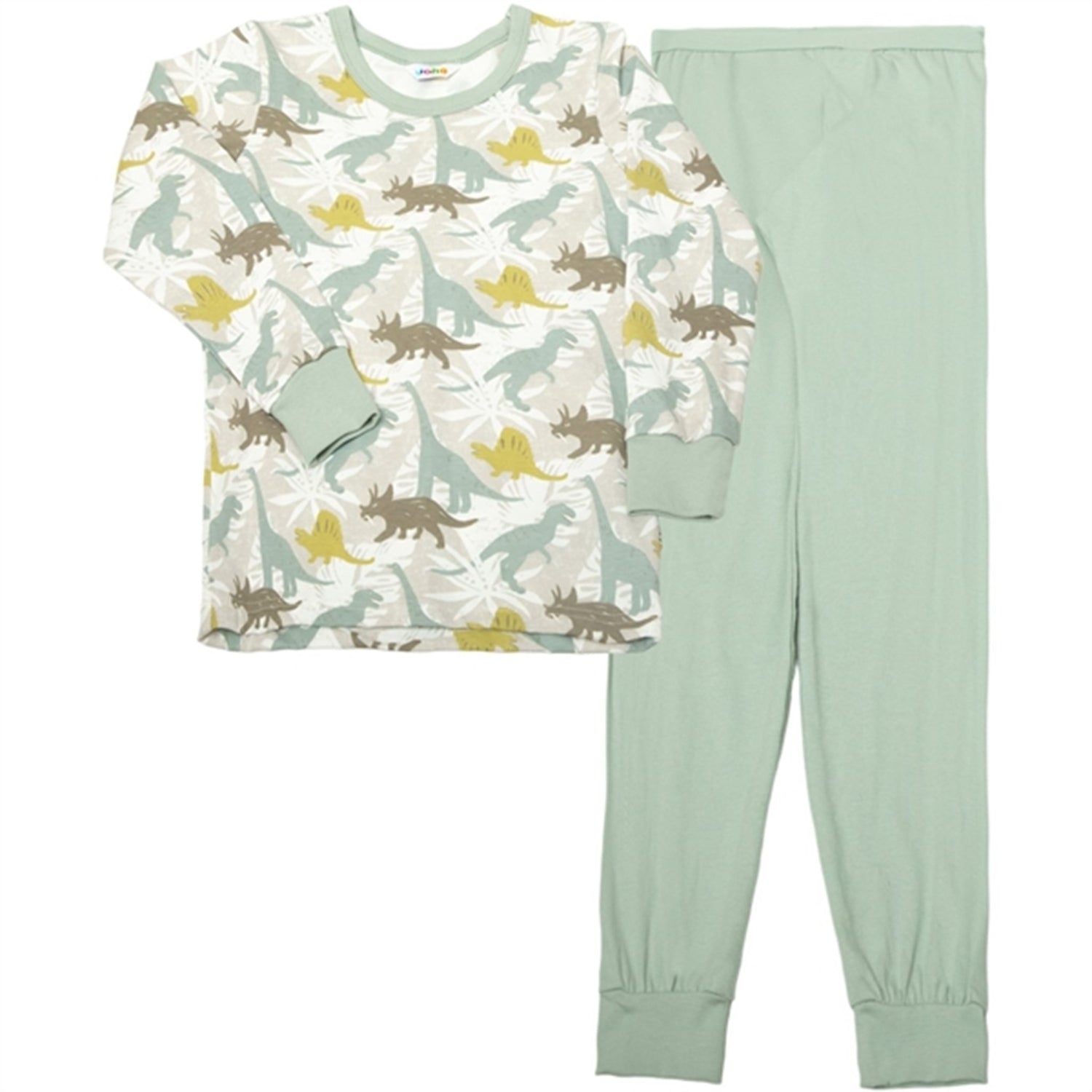 Pajama set. Blouse with long sleeves. Cool print with contrasting edges. Plain trousers with soft elastic at the waist. The whole set is in a soft and elastic organic cotton quality with /lycra, which is very comfortable to wear. Organic cotton and Øko-tex 100 brand.