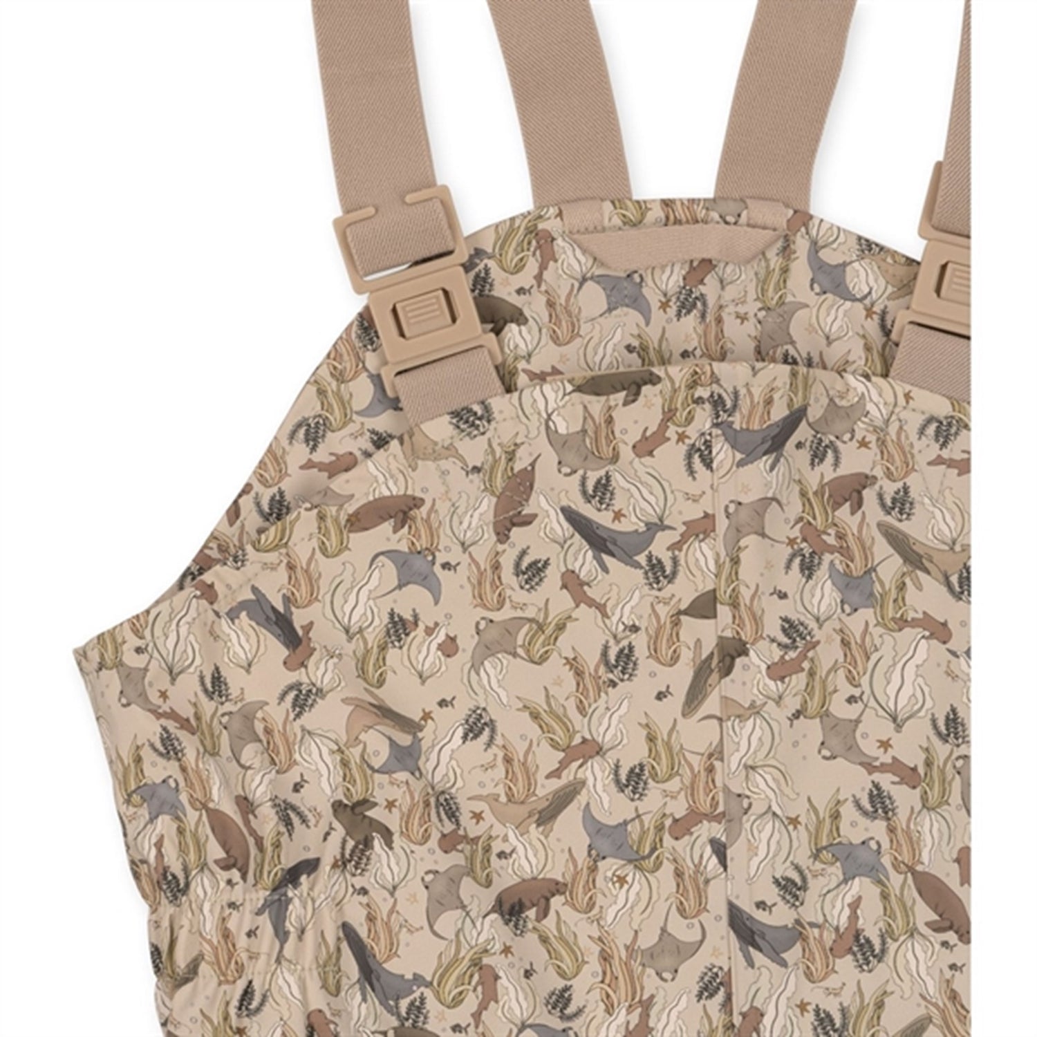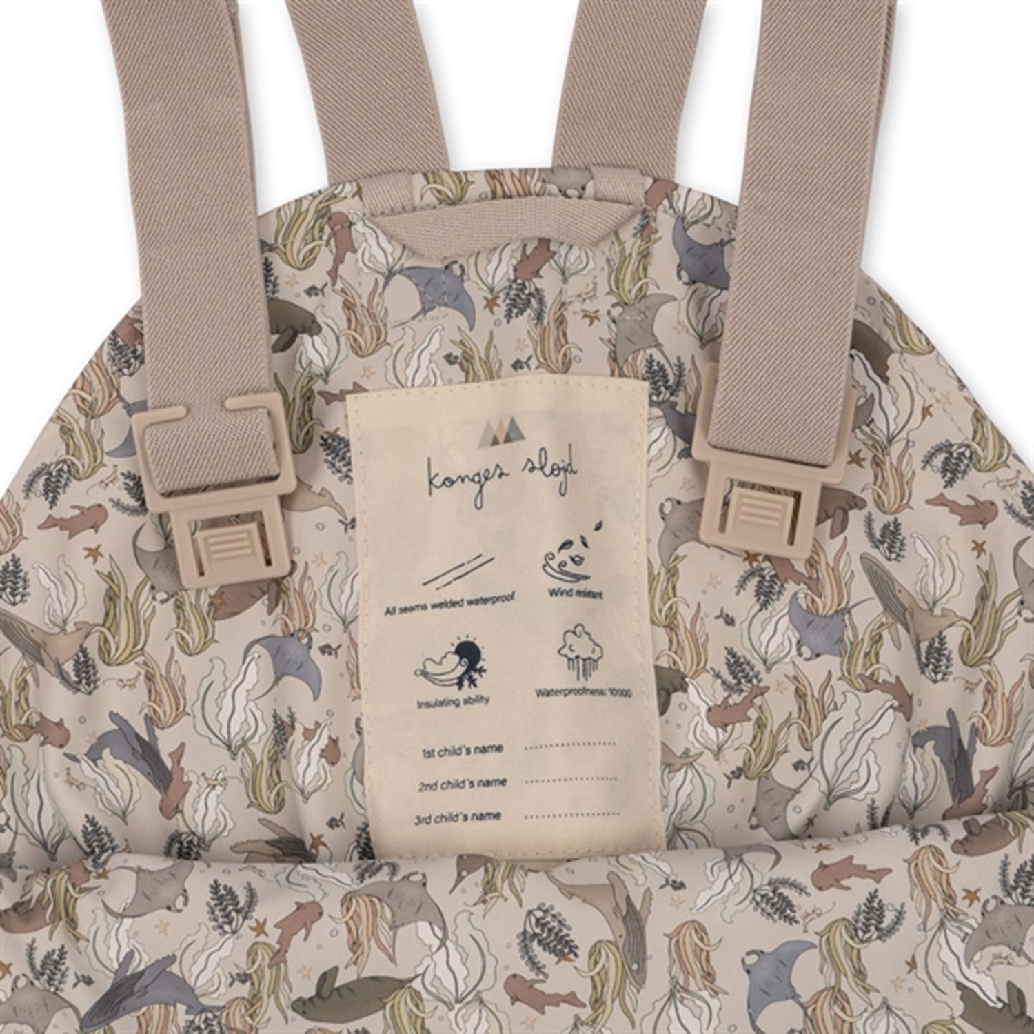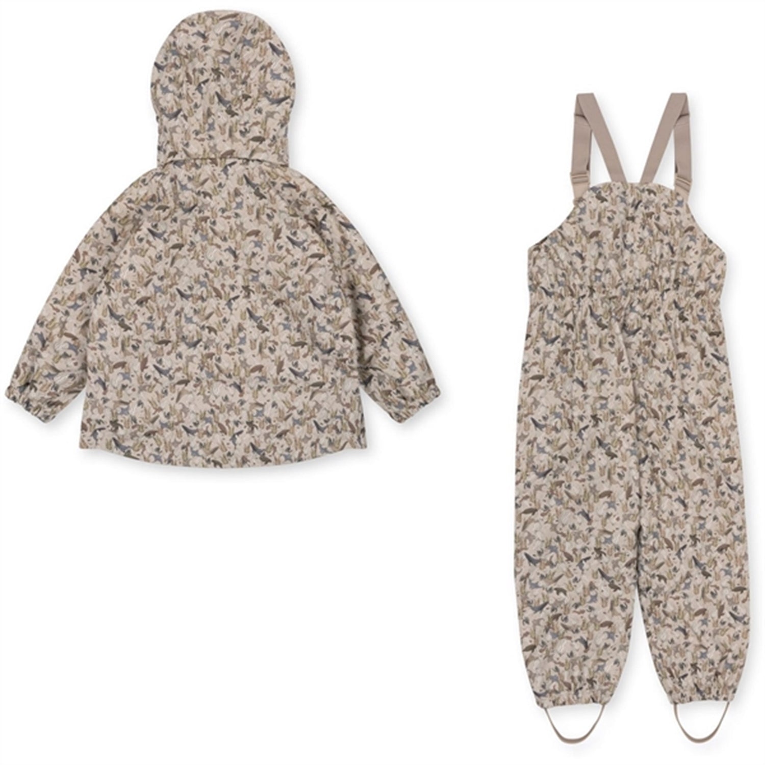Windproof and waterproof PU rain set with warm fleece lining. Upholstered with THERMOLITE filling made from recycled fibres. The surface is treated with BIONIC FINISH ECO, a highly breathable and water-repellent impregnation. The hood is removable and fastens with buttons. Elastic inserts at the hands and feet ensure that the rain set stays in place. At the feet, removable rubber straps ensure that the boots stay in place. On the inside of the jacket, the braces make it easy for the child to take off the top when they get too hot or go inside. The jacket closes with both a zipper and buttons. Both the jacket and the trousers have a practical loop for hanging and two practical front pockets. A must-have for the cold and wet seasons. The PU quality is very durable and easy to clean. All seams are taped.Sizes 9 months to 4 years have adjustable straps and sizes 5-6 have an adjustable waistThe rain set has a water-repellent rating of 10,000 mm and the set is completely waterproof d