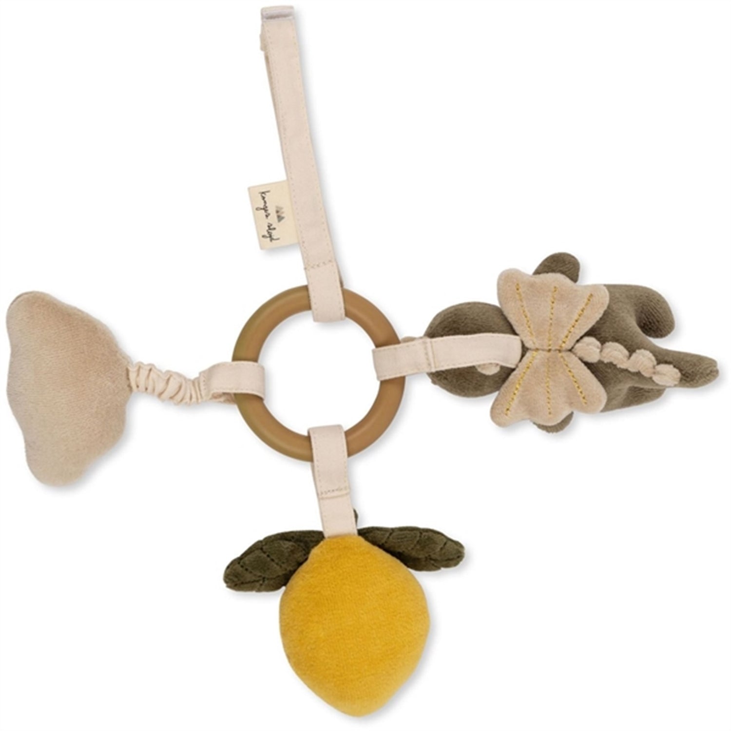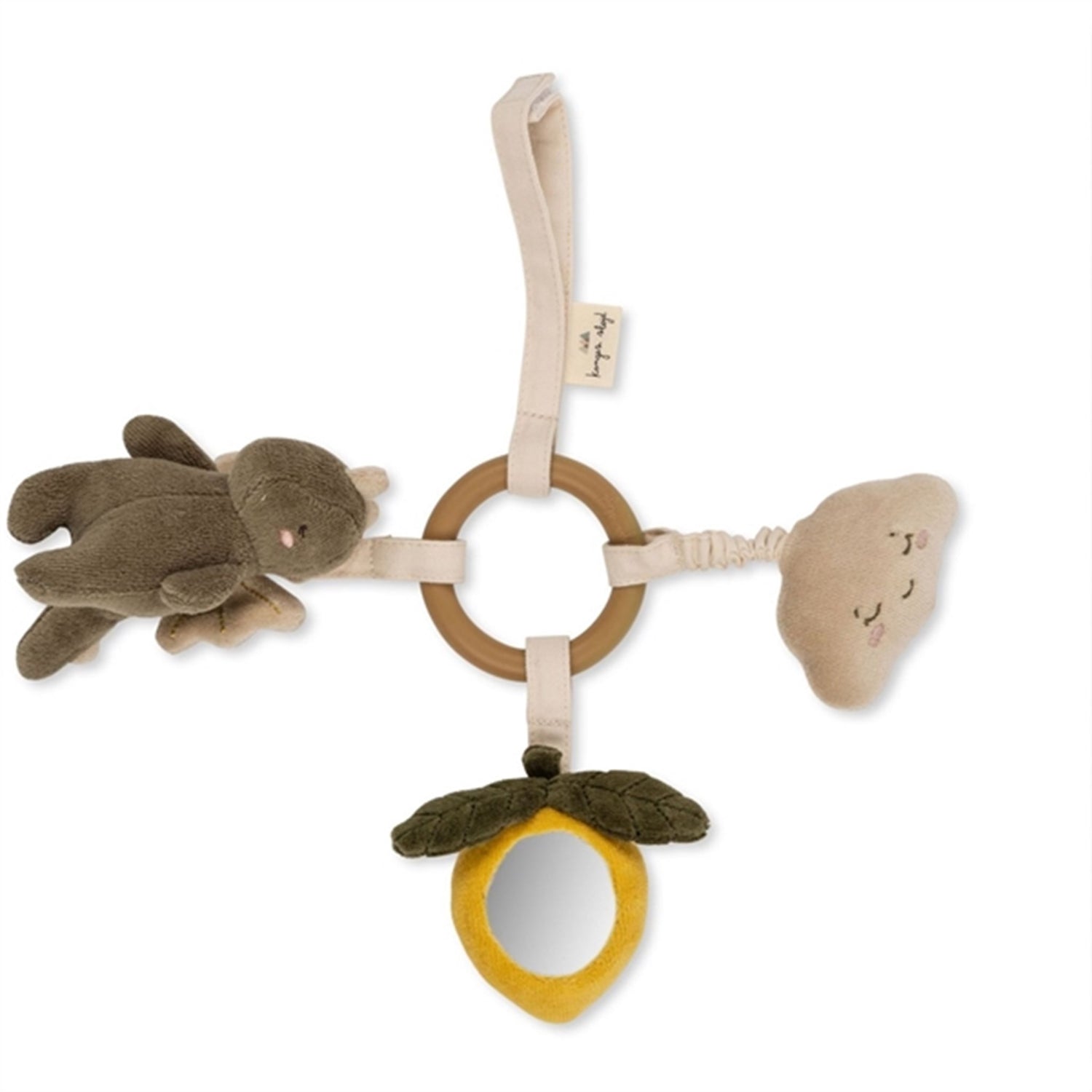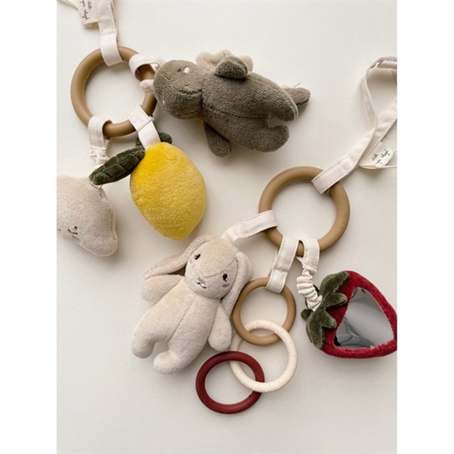 safe for babies to chew on. The rings have organic cotton straps with small figures attached to them, made of organic cotton with recycled polyester filling. One strap is elastic, one figure has a plastic mirror and two figures make a gentle ringing sound. The activity ring also has a strap to hang up the toy. The toy is designed to develop babies' tactile senses.