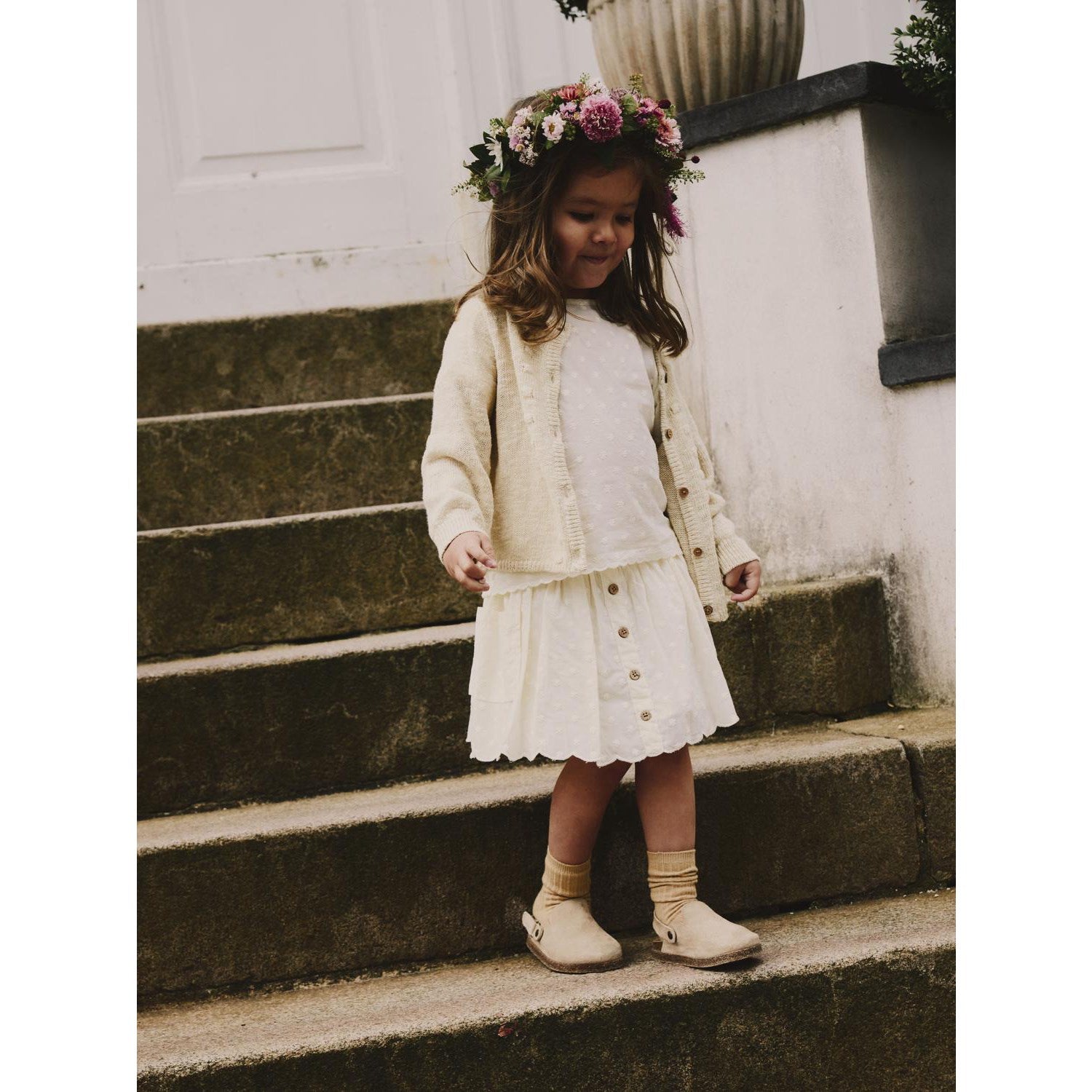 The lovely Lil'Atelier Coconut Milk Millet Skirt is a delicate addition to any girl's wardrobe! Made from 100% organic cotton, this skirt features a lightweight texture pattern and adjustable waist for added comfort. With convenient side pockets and button closure, it's perfect for any play adventure. Create a perfect outfit with this beautiful piece from Lil'Atelier - a brand that cherishes nature and comfort with high quality