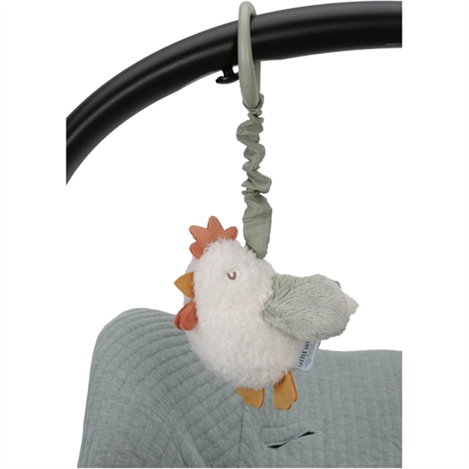 Move around freely! This cheerful chicken is designed with playful textures. When you pull on it, it starts vibrating. Easily attach this fun toy to a car seat, playpen, or stroller. Made for little hands to grasp, it provides endless entertainment at home and on the go. Laughter and giggles guaranteed.