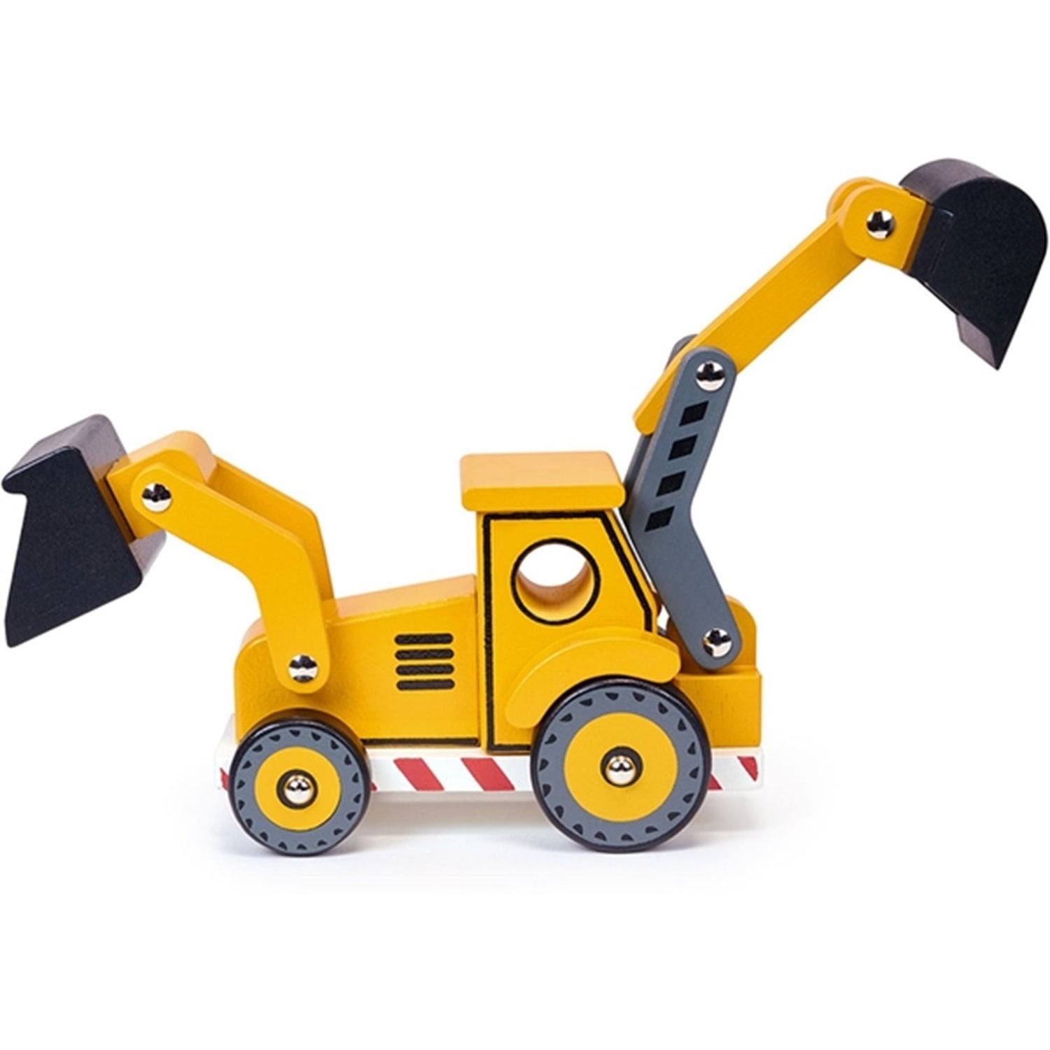 - The impressive construction vehicle features 4 wheels and 2 movable arms with a black shovel in front.