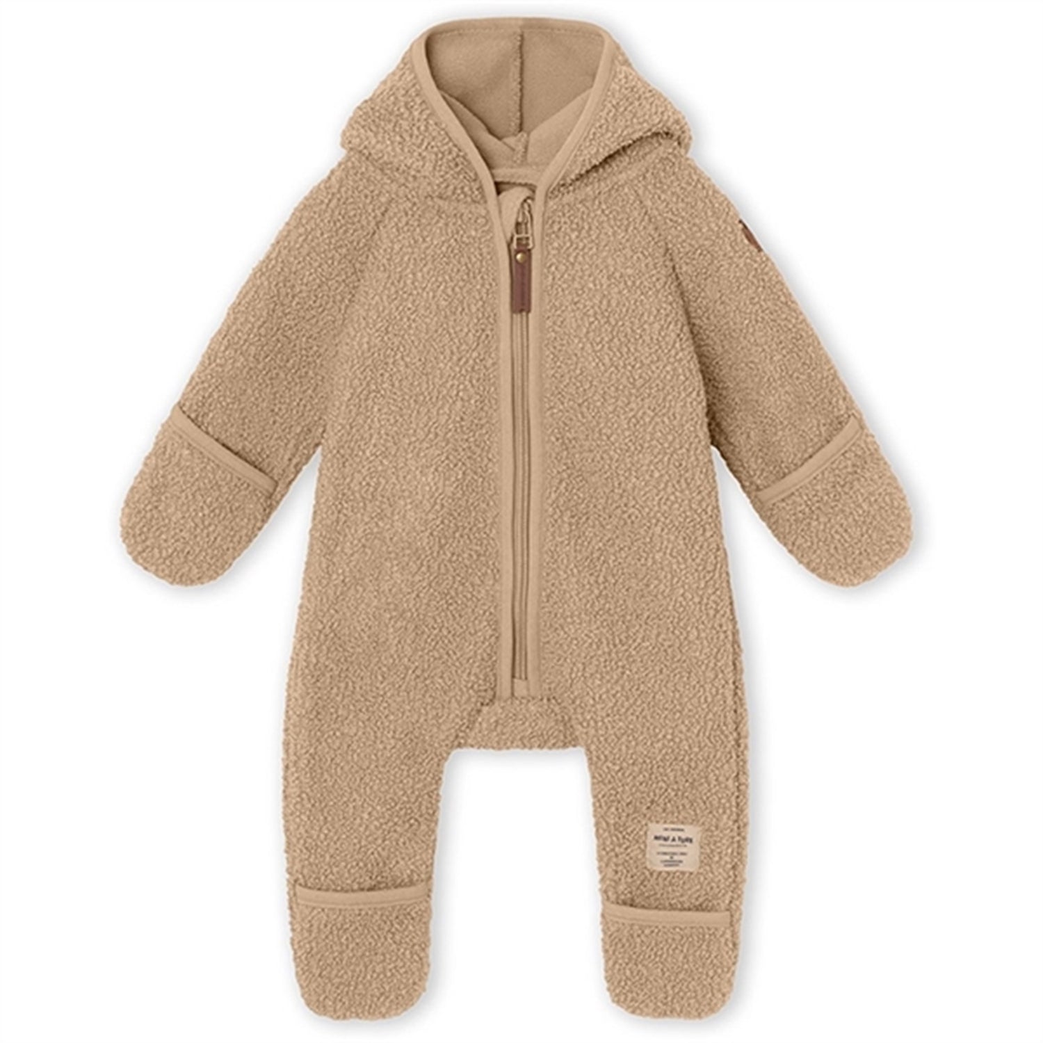 Soft jumpsuit from MINI A TURE in a soft teddyfleece quality.The suit has a signature, pointed hood with a small tassel. The zipper has a built-in stopper to protect thechild's neck. MINI A TURE logo at the left leg. On sizes 1m/56cm - 6m/68cm, the sleeves and legs are finished with built-in mittens and socks, which can be folded if needed. From size 9m/74cm and upwards, sleeves and legs are completed with a ribbed edge.