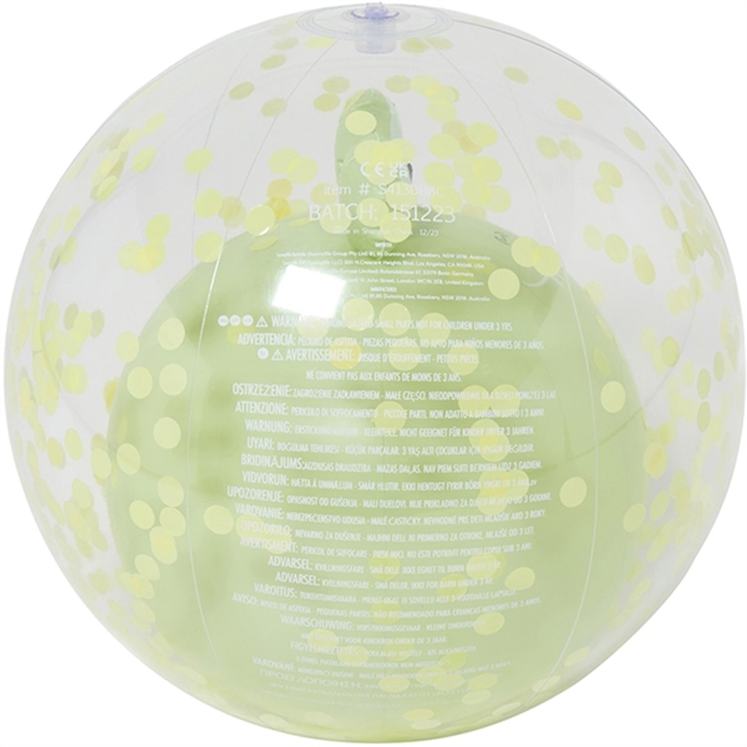 Features 3D Character inside of the inflatable ball.Internal biodegradable paper confetti.Includes repair patch in case of punctures.Made from durable, non-toxic Phthalate free PVC.Our floats and inflatables carry important safety labels that may not be shown in all photography.This is not a lifesaving devise, use under constant competant supervison. Do not Dive or Jump. 100% PVC
