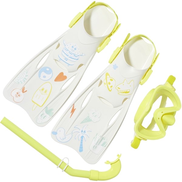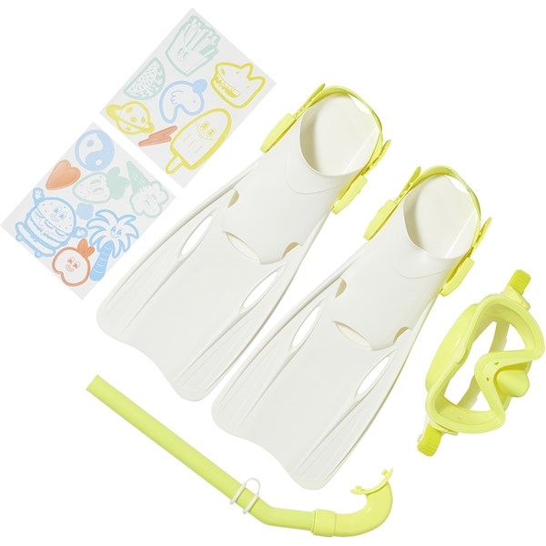 Includes stickers for customization.To fit shoe size EU 35-38, UK 3-5, US 4-6.Set includes x1 mask, x1 snorkel, x2 flippers and x1 carry bag.Adjustable strap on mask to prevent slipping and provide a snug fit.Adjustable strap on flippers to grow with you. 45% PE, 30% PVC, 15% PC, 10% Silicone,