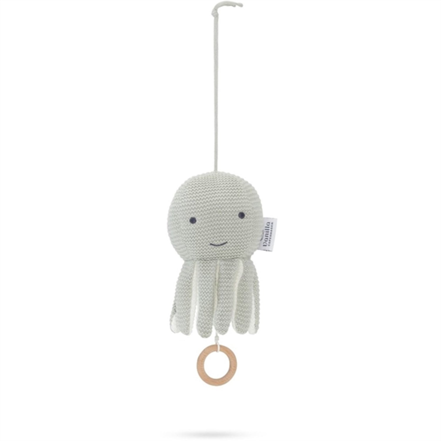 Music mobile Little Squid Little Squid music mobile from Vanilla Copenhagen is a cute knitted teddy bear Little Squid is a sweet and soft teddy with quiet music. The squid will quickly become one of your baby favorites. Pulling the tree ring and the music mobile will play the finest clear and calm "Sleep baby sleep" which can make any baby relax. Dimensions: Dimensions: 30 cm Material: 100% organic cotton GOTS – Filling: Polyester Age: From 0 months Pull in the tree ring and the mobile will play a classic quiet "Sleep baby sleep". Care instructions: Machine washable 30° C.