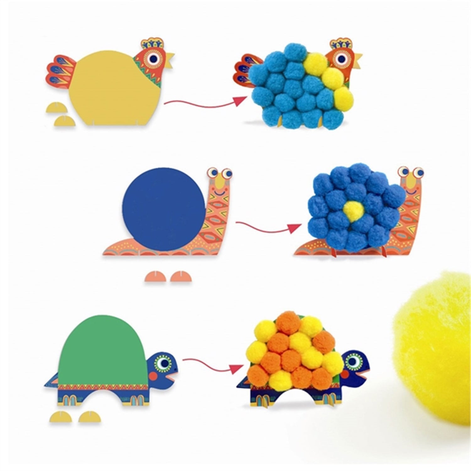 Djeco creative collage with animals Fun box for creative space Bring the animals to life by sticking soft cotton balls on the figs Put your feet on so the animal can stand up