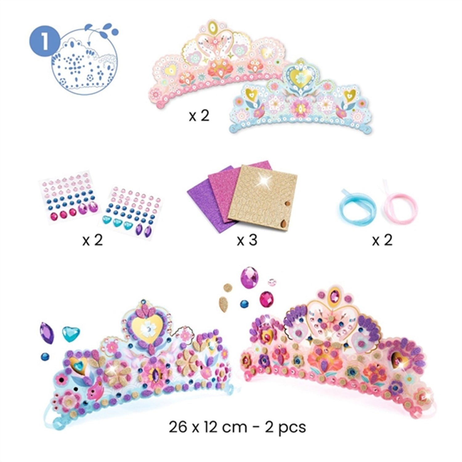 - There is enough to do:- 2 tiaras- 2 fairy wands- 2 paper jewelry sets- 1 box- 1 mirror