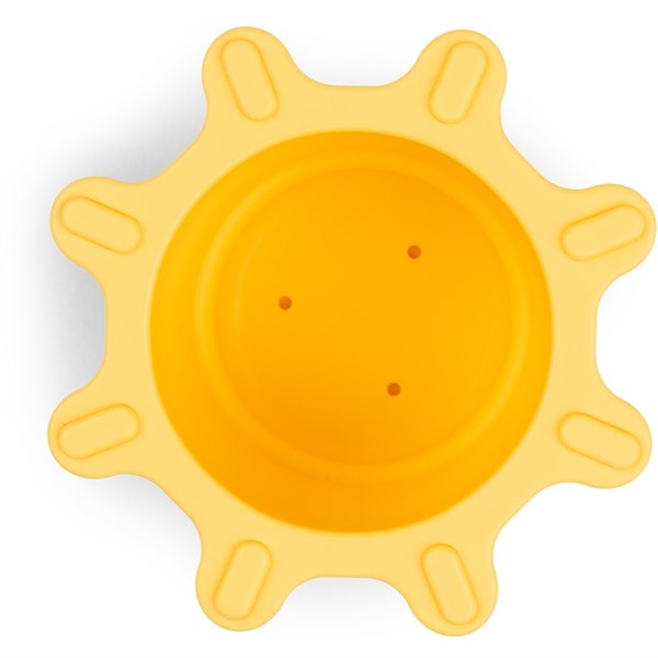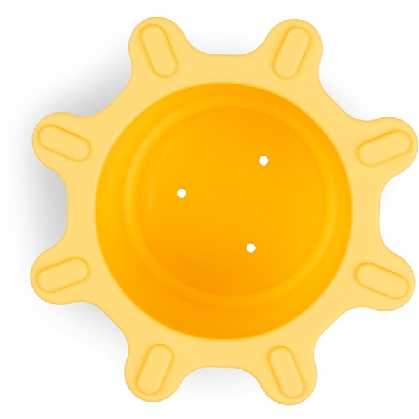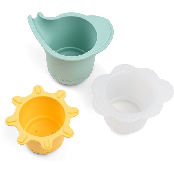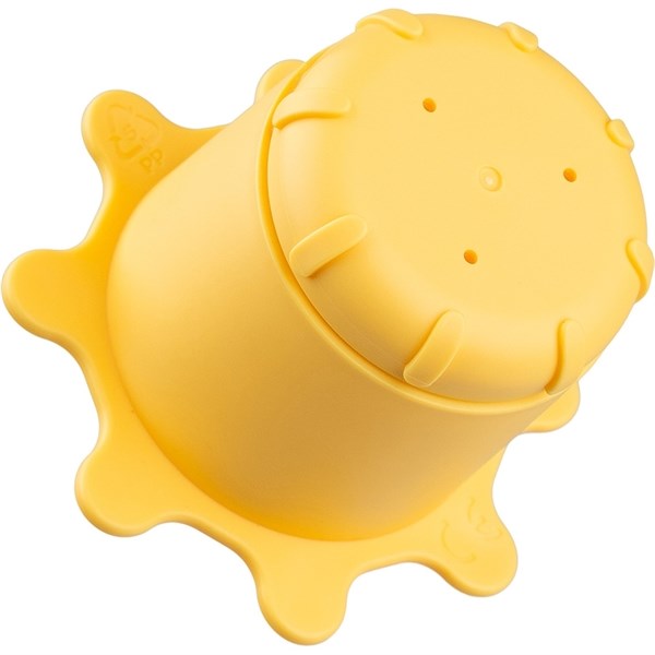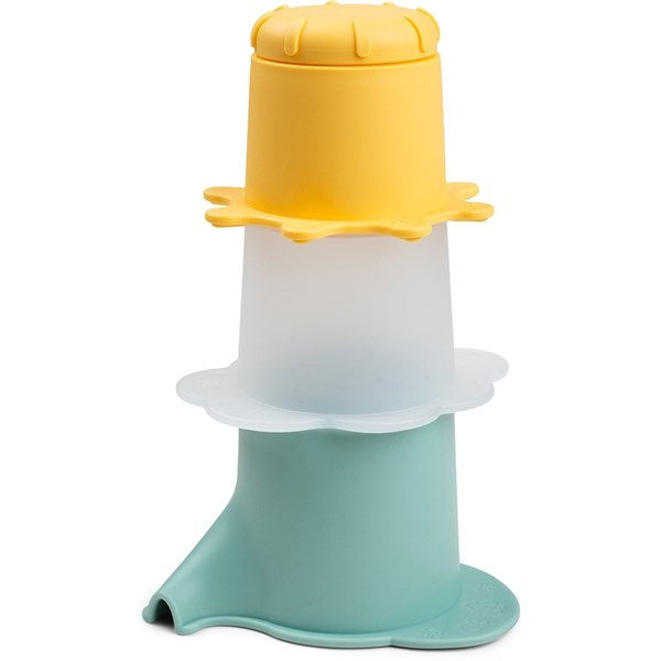 Contains a blue Elphee shaped cup, a semi-transparent white cloud-shaped cup with holes in the bottom, and a yellow sun-shaped cup with an open and close feature