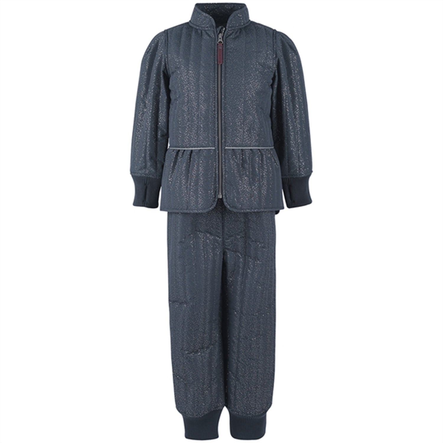 The thermal jacket has several details such as an all-over print of gold glitter dots. Ribbed cuffs with thumb holes. Gathered skirt gives width at the bottom. Closes with a zipper with chin protection. Reflective piping helps keep baby visible. Available in different colors.