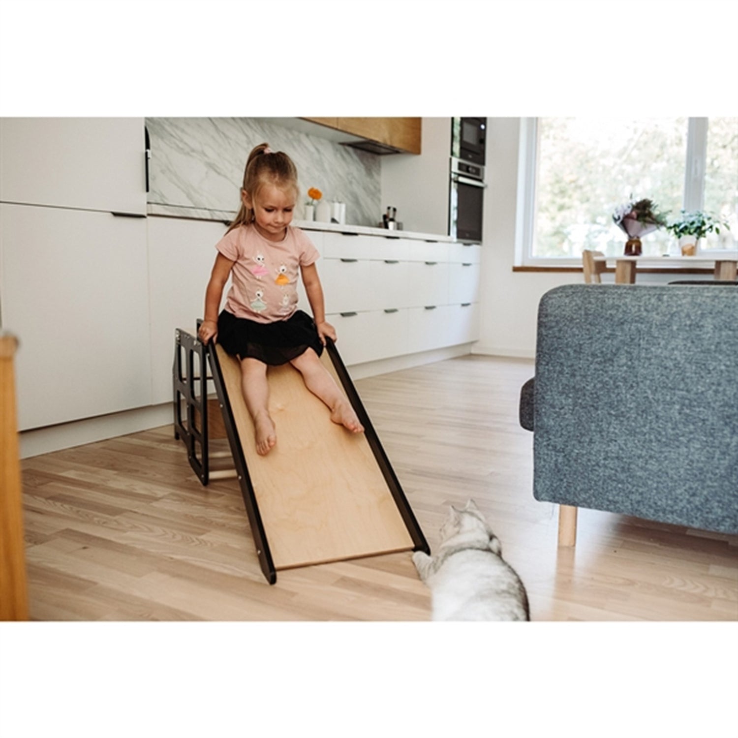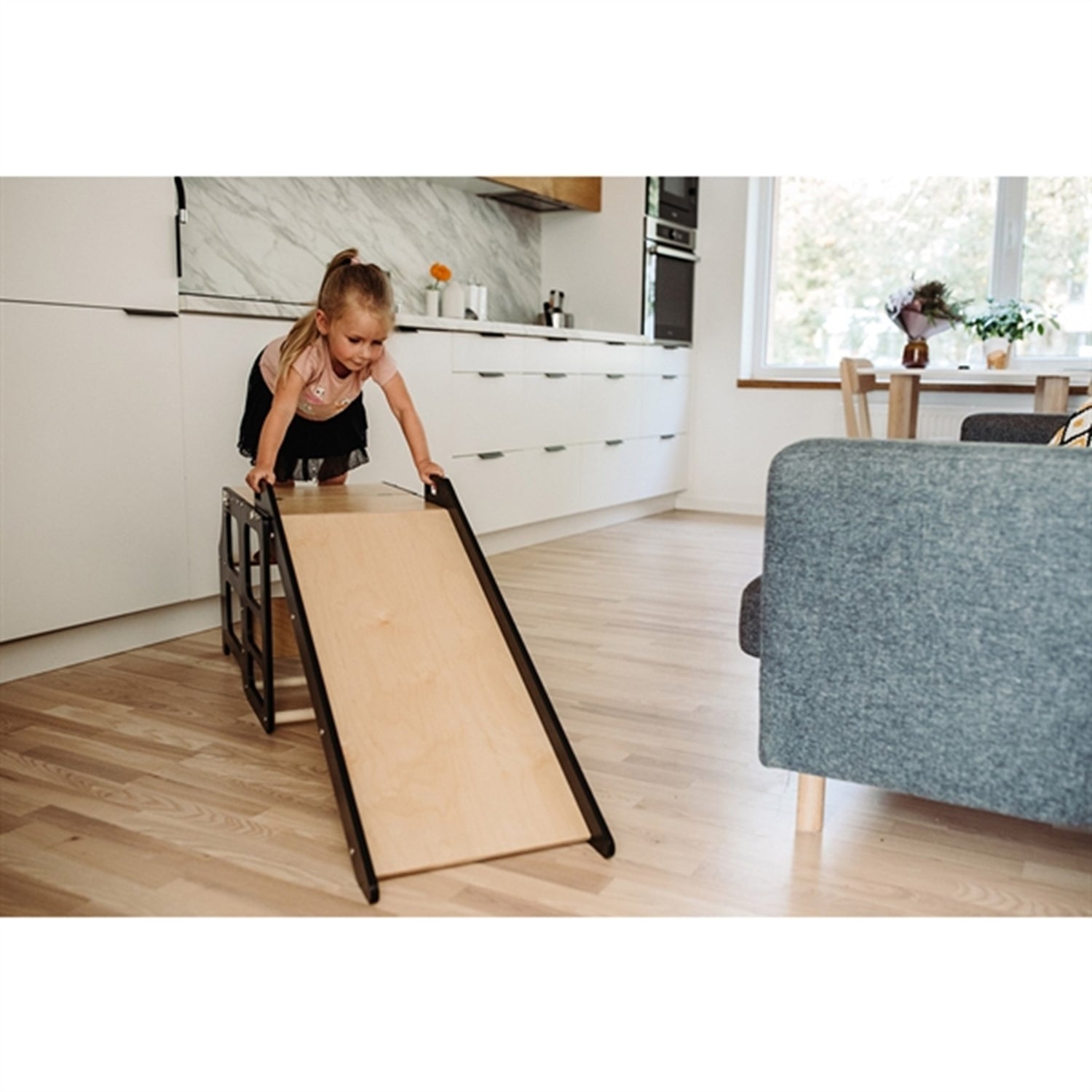 - Then the children can both help in the kitchen, slide on the slide and sit at a table