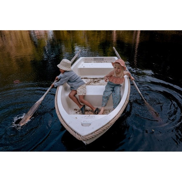 Lucy swim sun hat in cute all-over raspberry print in certified UPF 50+ protection. Has a round head shape, with strings that ensure it stays in place. Features a wide brim, which blocks the sun.