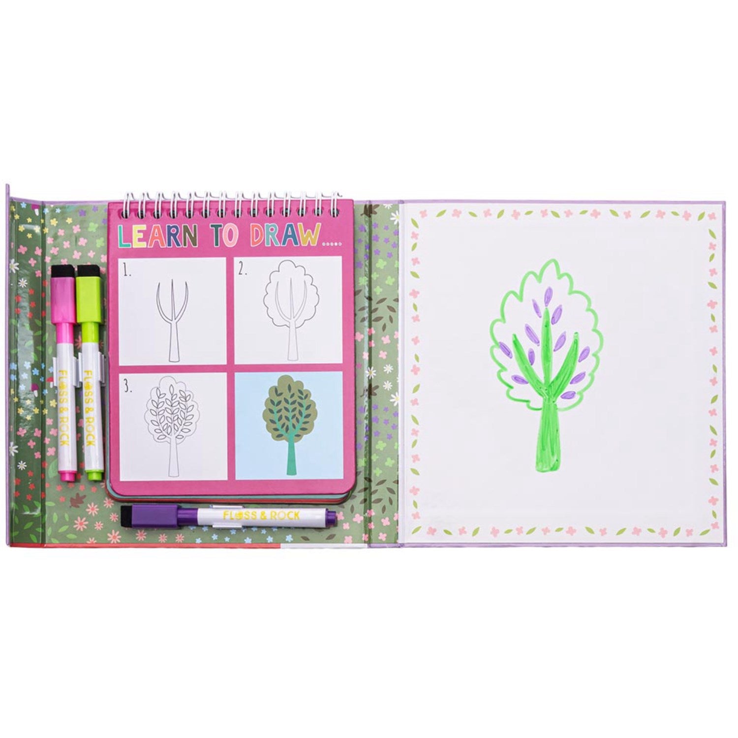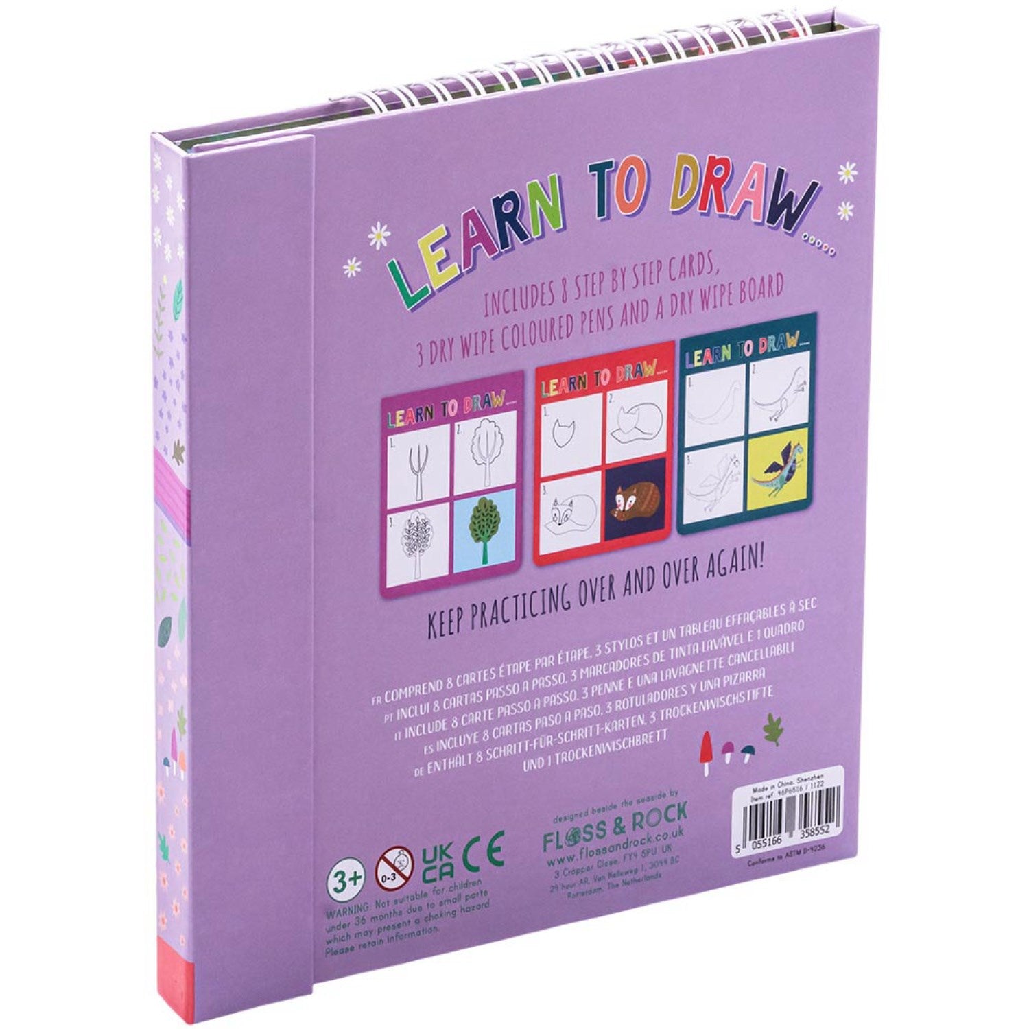 Our Learn to Draw includes 3 colour dry wipe pens with eraser lids and 8 step by step picture cards teaching you to draw. The pictures are spiral bound so easy to flip to the next one with an empty page for you to make your masterpiece! Keep practicing over and over again!