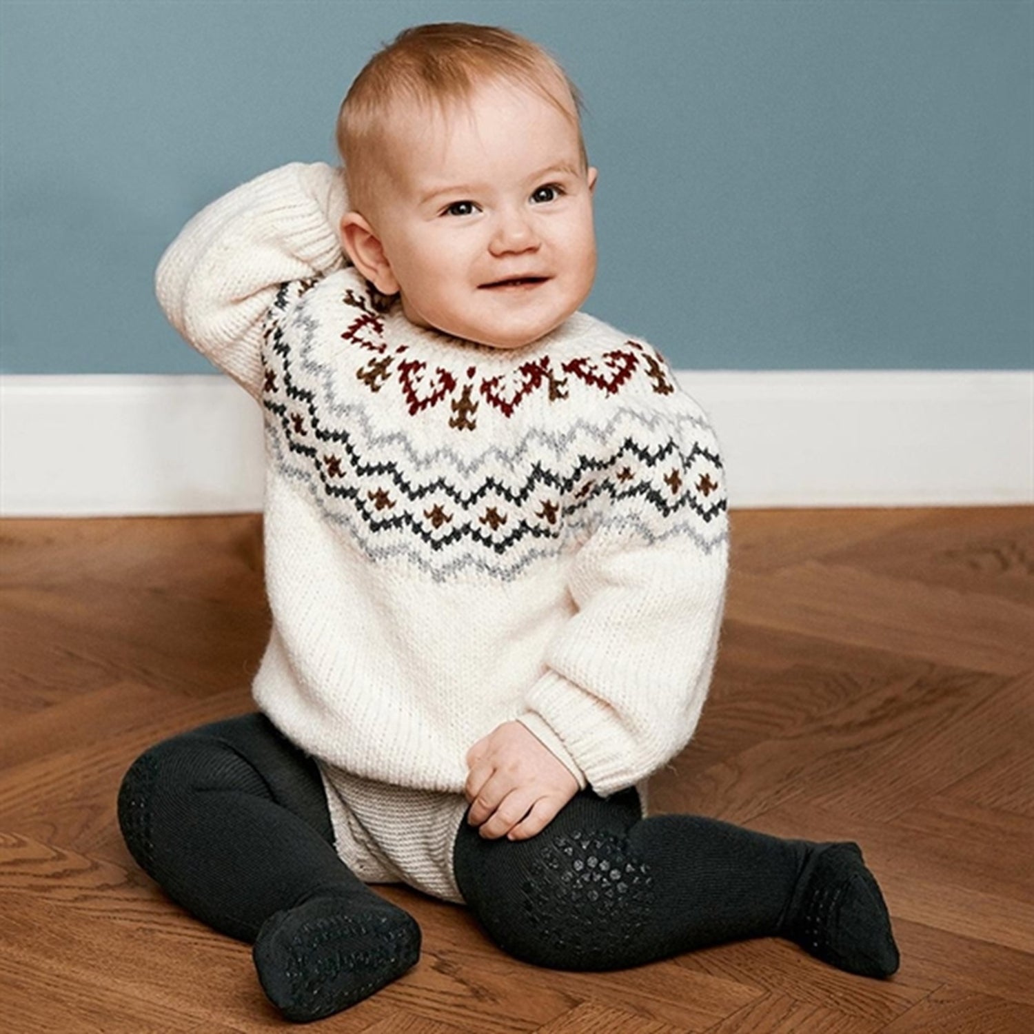 GoBabyGo slip-resistant tights have rubber pads under the feet so that children can walk and play without having to worry to slip on smooth floors. Rubber pads on knees, under the feet and on the toes provide better stability on slippery surfaces. Strengthens the child's motoric skills, balance, and self-confidence. Made of soft superwash wool material with an adjustable stretch band that guarantees a good fit, good freedom of movement and feels comfortable on the skin. Tested and approved for harmful chemicals and pollutants. Danish design, produced in Europe and Oeko-Tex Standard 100 certified.The non-slip rubber pads are made from silicone and are free from phthalates. For longer durability please wash inside out and on wool program.