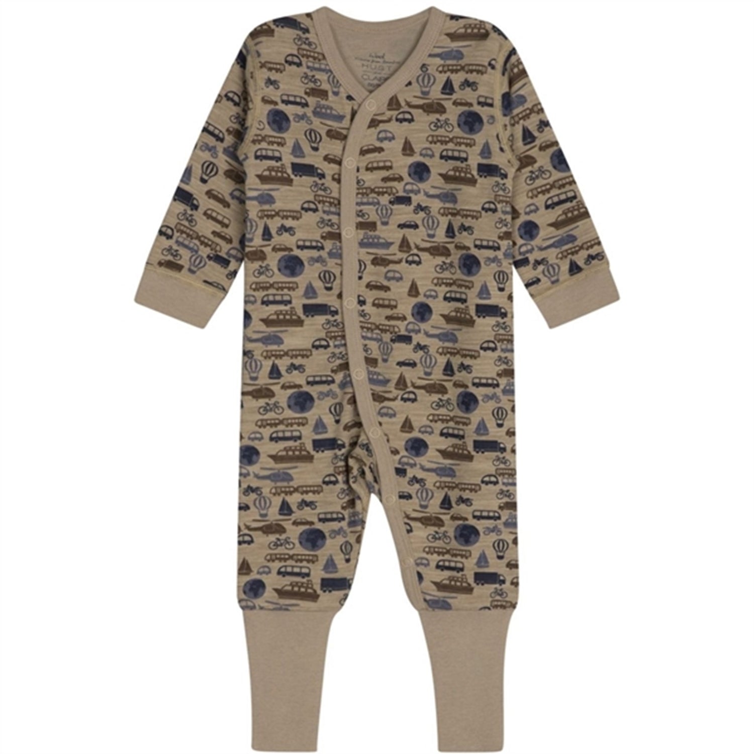 Long-sleeved car / hot air balloon print jumpsuit in a comfortable stretch bamboo viscose and wool fabric. The jumpsuit fastens with buttons in front with wrap-around look down over the tummy to the left foot. Features longer cuffs at the feet which can also be folded and used as socks. Foldable feet up to size 86. Wool on the outside and viscose from bamboo on the inside. This product is Oeko-Tex 100®-certified.
