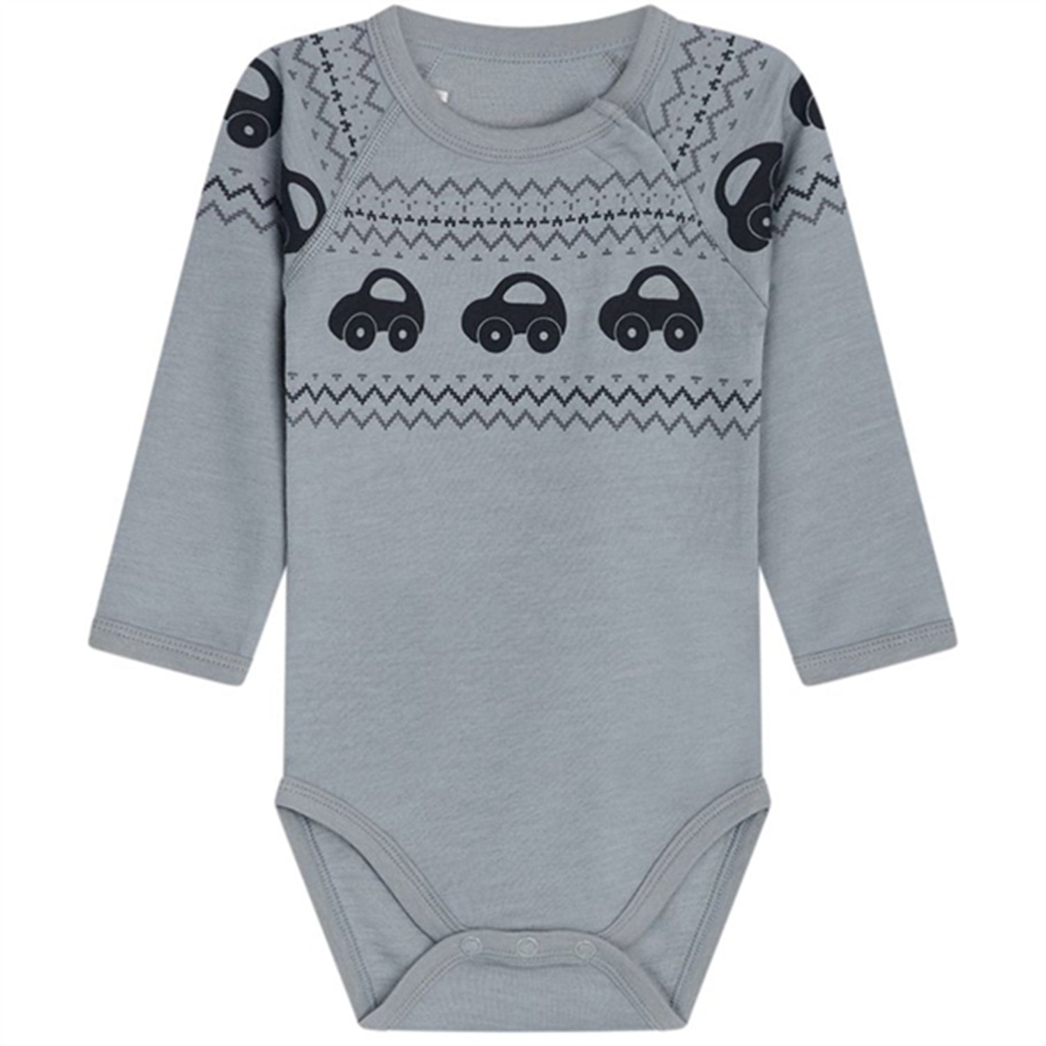 Long-sleeved bodysuit in soft stretch wool and bamboo viscose. Some with prints of rabbits or cars. Buttons on the left shoulder and between the legs. Wool on the outside and viscose from bamboo on the inside. This garment is Oeko-Tex 100® certified.