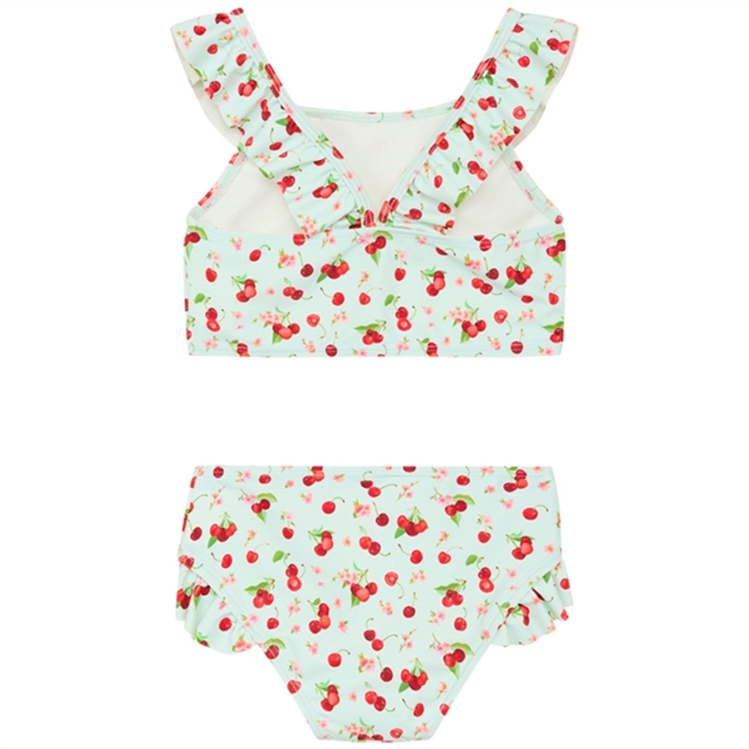 The bodice has frilled straps that gather at the back. The bottom has frills at the legs. The bikini has a UV50+/UPF50 filter. This product is certified with Oeko-Tex 100®.