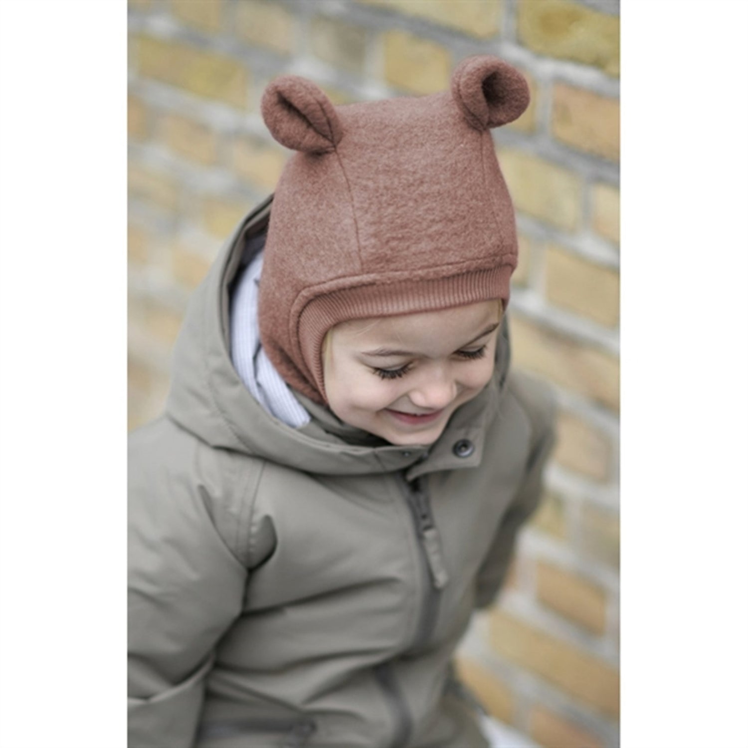 Nice Huttelihut balaclava in mottled cotton fleece. The Huttelihut balaclava hat has a round head shape with two teddy ears at the top. The balaclava has 2 layers, the outer layer consists of a strong layer of felt cotton. The inside consists of soft velour In the face opening there is a ribbed edge, and the balaclava has a practical split design with extra length at the back.