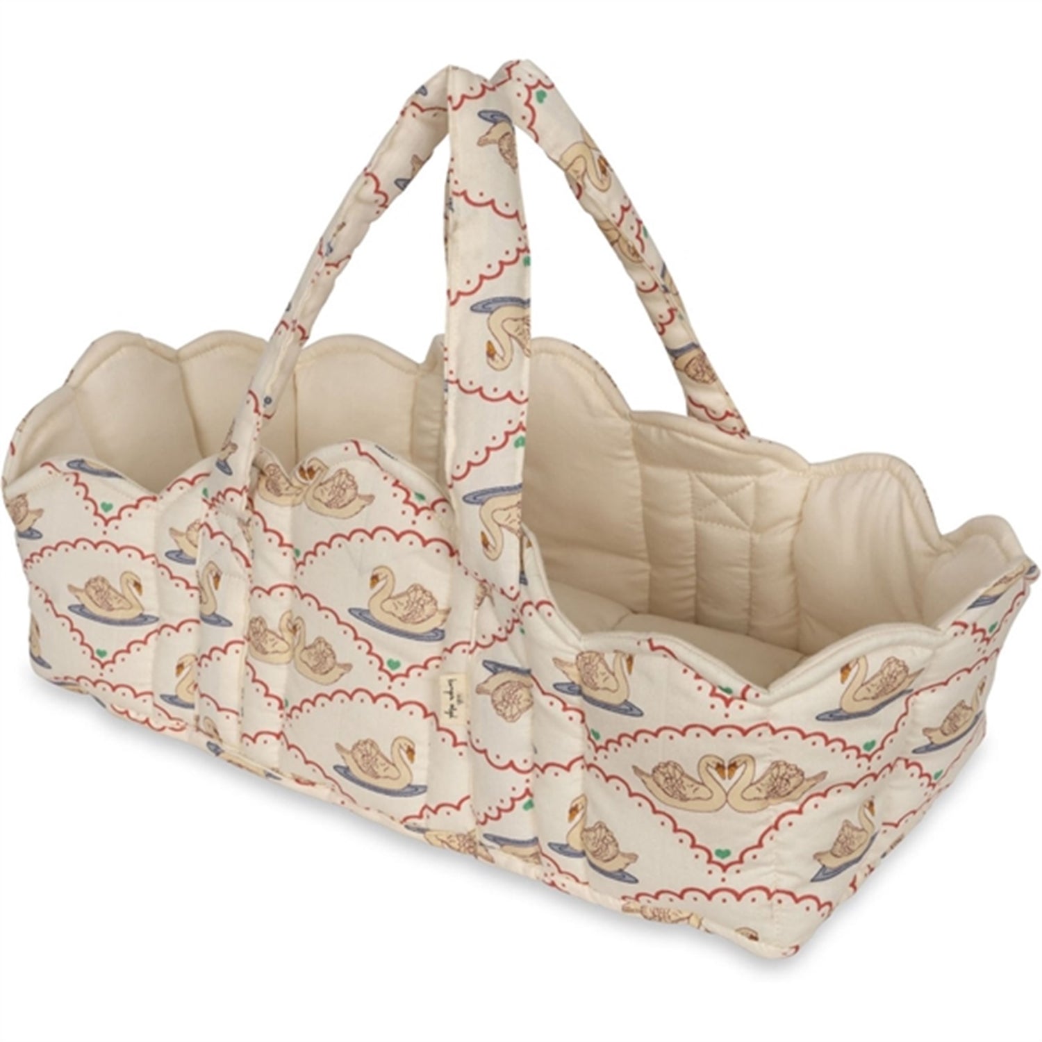 Padded doll lift made in 100% organic cottonDesigned with practical carry straps, soft piping and scallop shaped endingsMeasurements: 16 cm x 44 cm