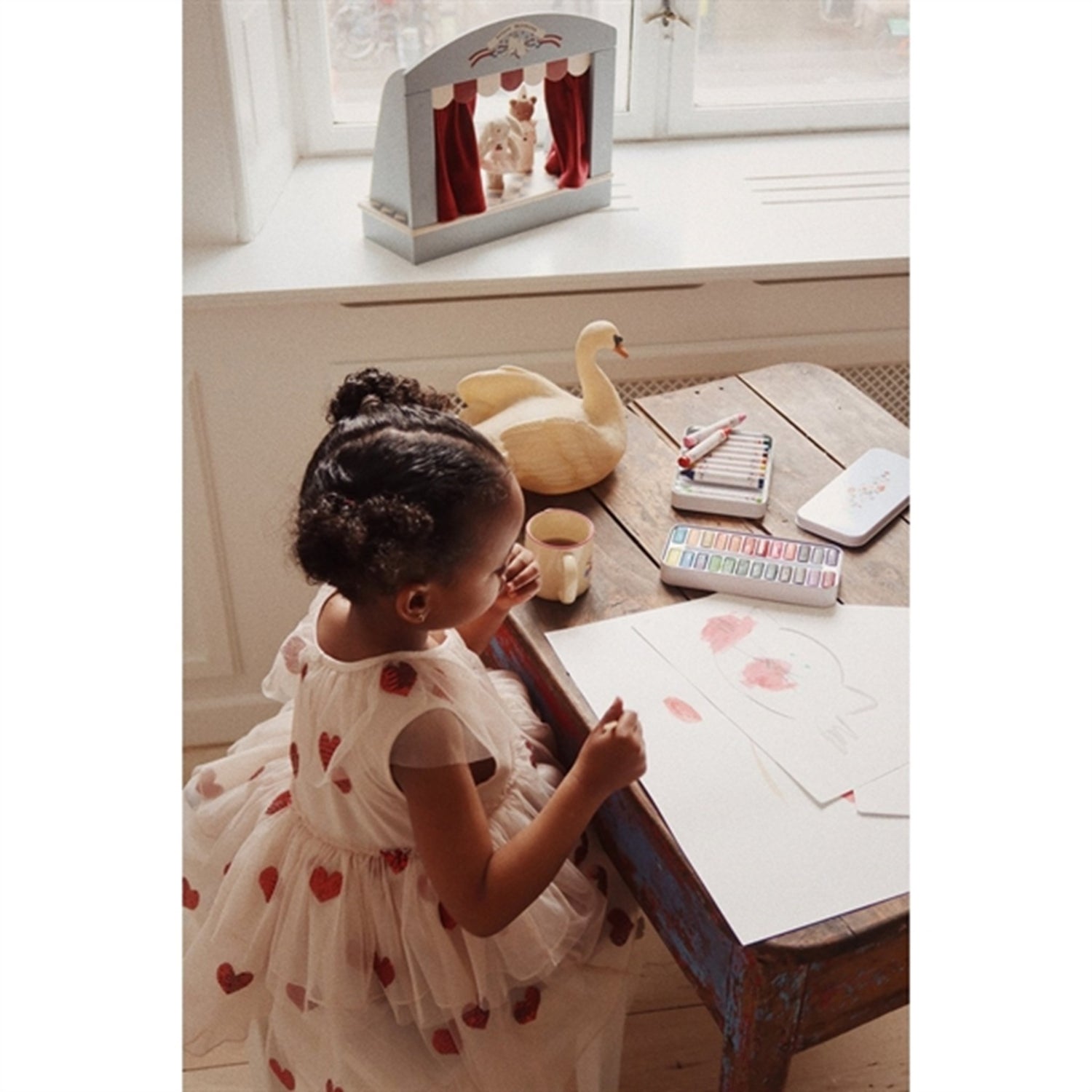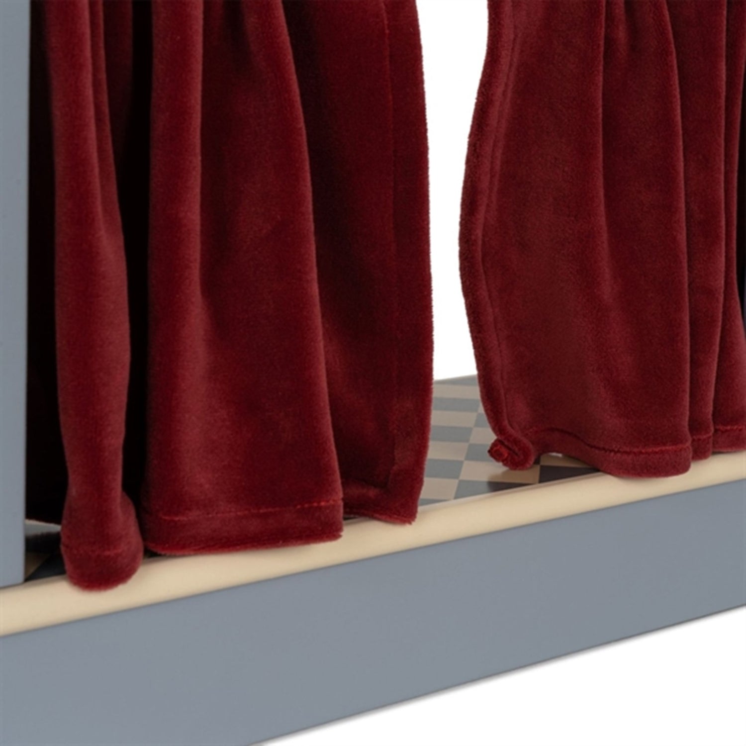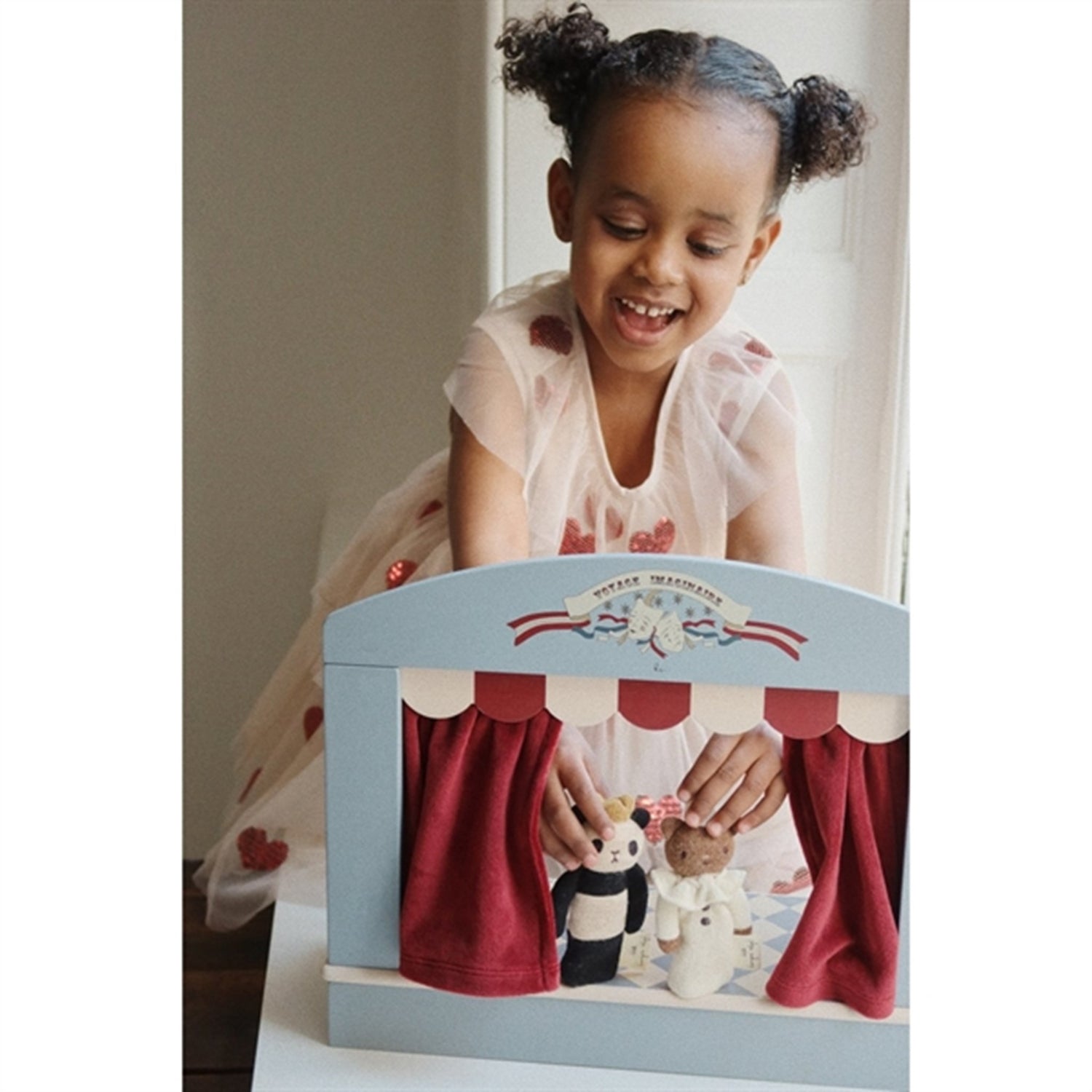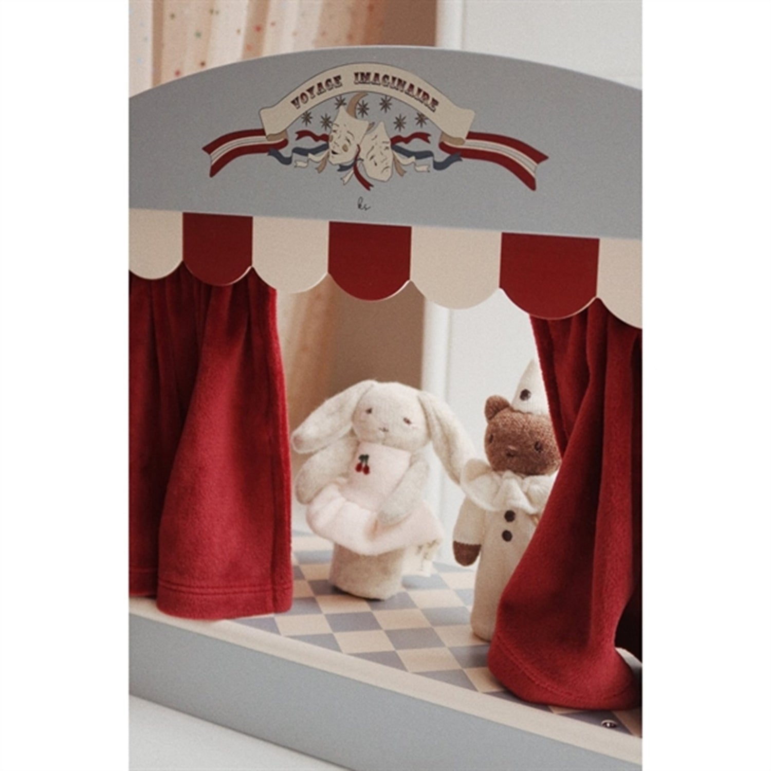 Wooden theater for small teddies and puppetsMade from 100% MDF with a velvet curtain 8 pieces in totalH: 30 cm x W: 37 cm x L: 14 cmThis product is made of polyester and FSC™-certified MDF certified by Control Union, License Number: FSC C177572. FSC 100% WOODWARNING:Choking hazard due to small parts. Not suitable for children under 3 years.3 yr +