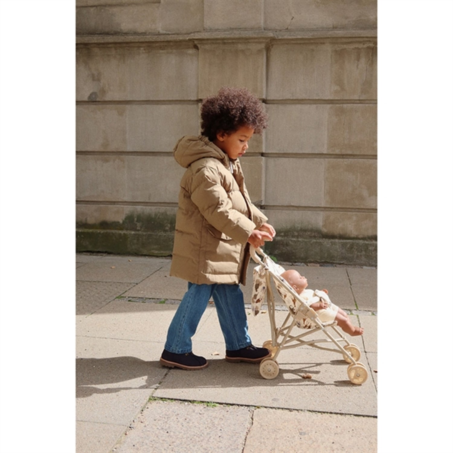 Doll pram with accompanying harness, bag, and double wheels on all four legs for extra stability. Removable fabric made of 100% organic cotton is included. Comes fully assembled. Easy to fold and store. The frame is made of iron covered with soft EVA material on the handles.