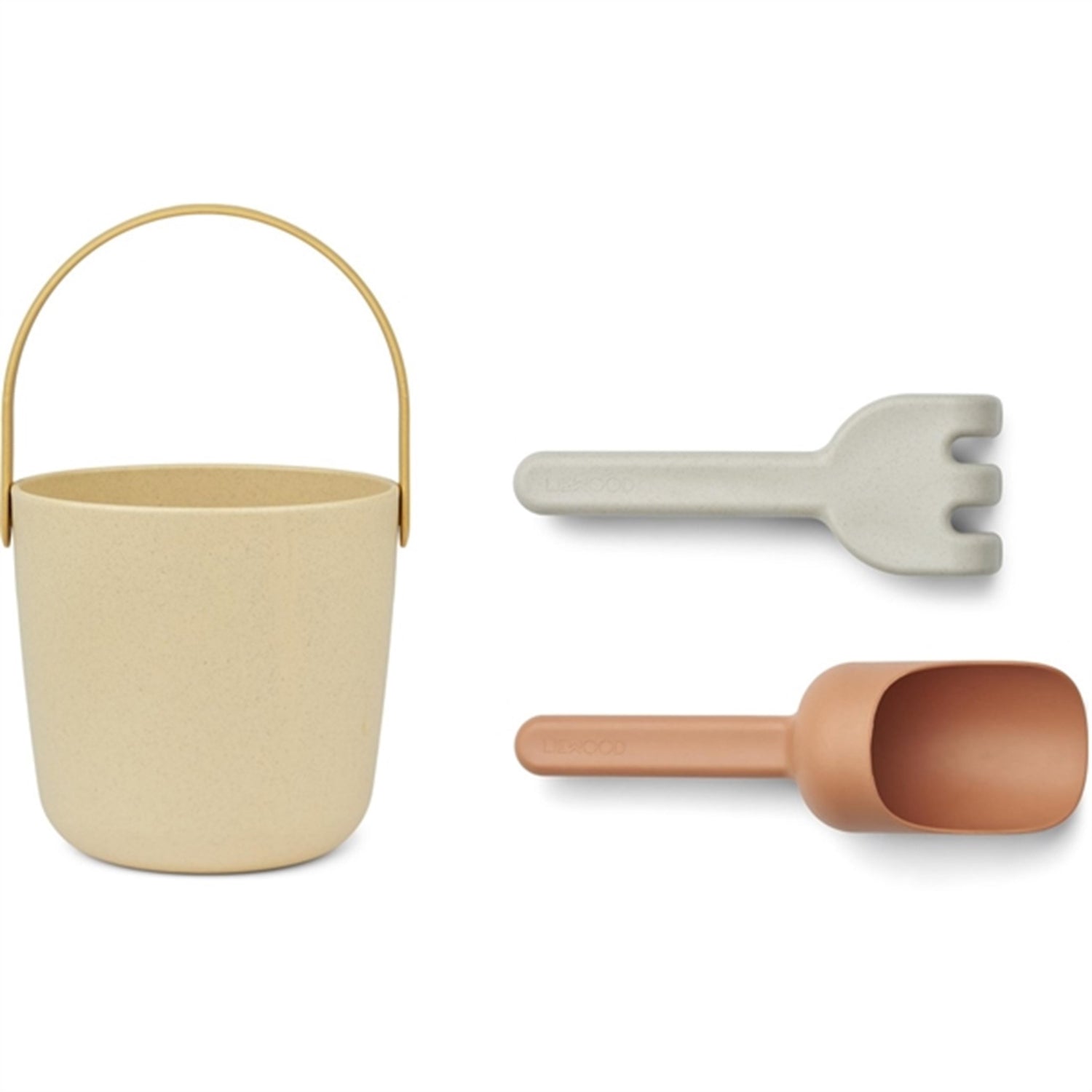 - Bucket: D: 16cm, H: 16cm, shovel: D: 7cm, L: 23cm, Rake: H: 2,3cm L: 20cm