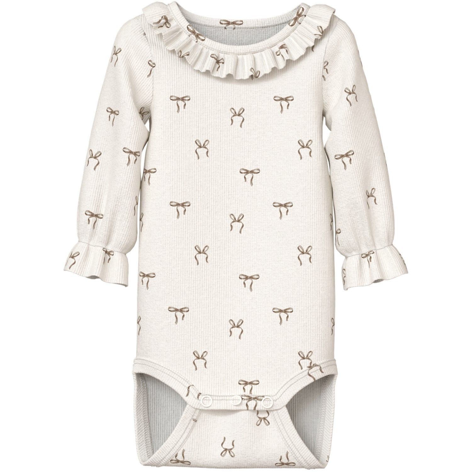 Get ready to dress your little one in style with the Lil'Atelier Coconut Milk Gavo Ema Slim Body bodysuit! Perfect for creating trendy and comfy outfits, this bodysuit is made from lightweight and stretchy jersey fabric with a soft interior. Featuring a charming O-neck, long sleeves with frilled cuffs, and press stud fastening for easy dressing, this bodysuit is both practical and stylish. The delightful frill details and all-over print add a playful touch. Plus, with at least 50% TENCEL™ lyocell and organic cotton fibers, this garment is eco-friendly and gentle on your child's skin.