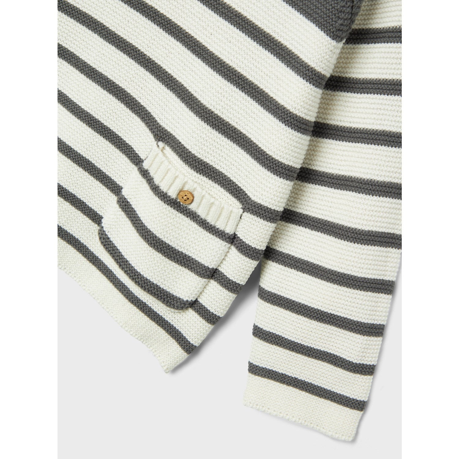 Dress up your little one in style with the Lil'Atelier Pewter Kadin Knit Blouse! This adorable flat knit pullover features a classic round neck, long sleeves with ribbed cuffs, and a front pocket for added charm. The button details add a playful touch to this timeless piece. Perfect for creating comfy yet trendy outfits for your child, this blouse is a must-have staple in any little wardrobe. Let your kid stand out with this quality everyday essential that combines comfort and style effortlessly.