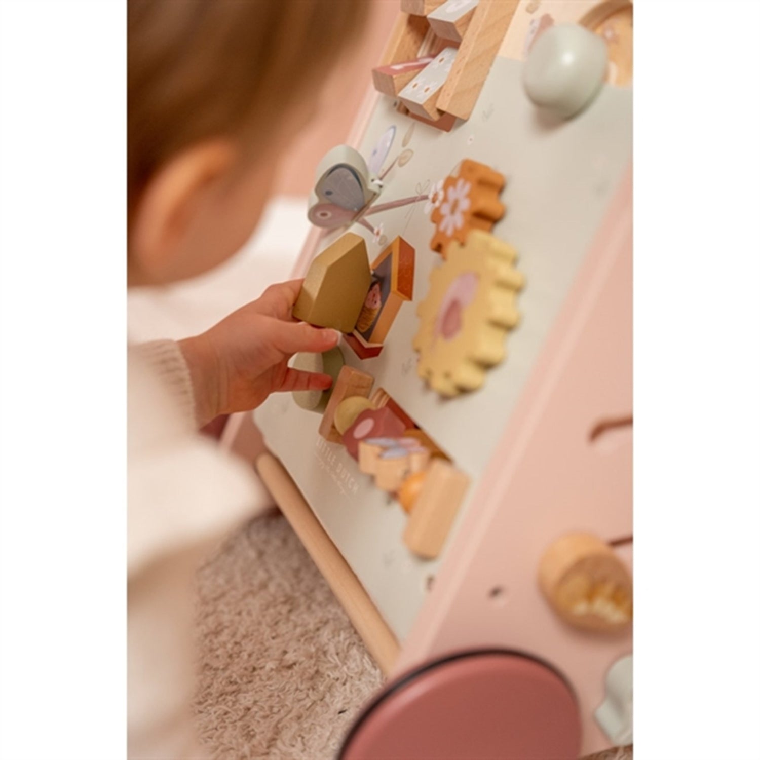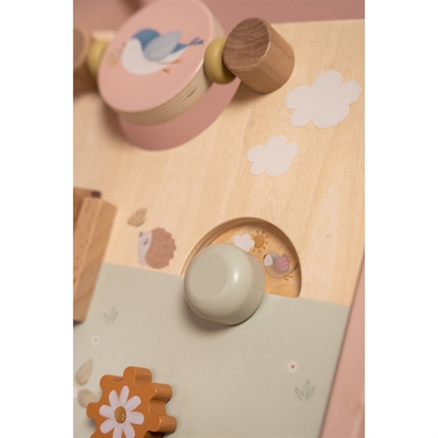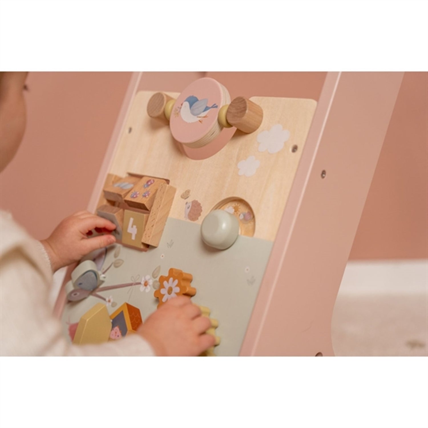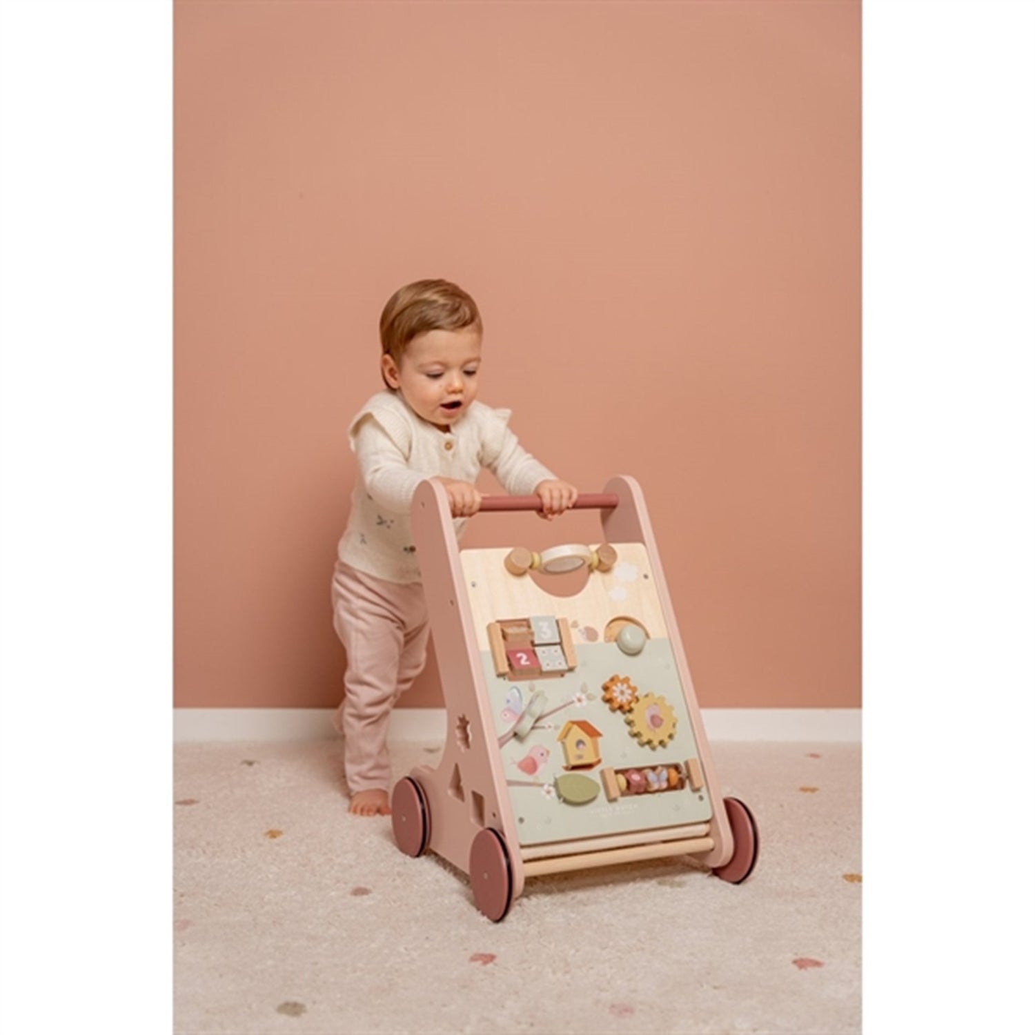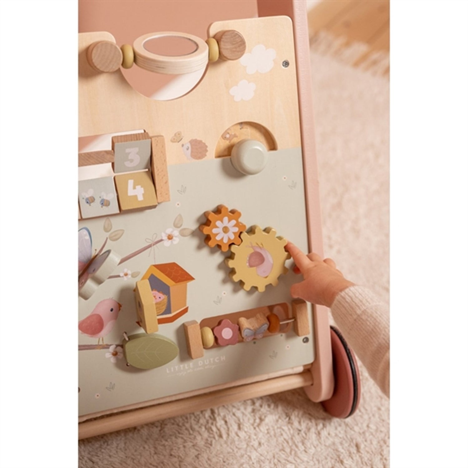 Walk, play and learn! This wooden multi-activity walker offers many challenging activities to support the development of your child's motor skills. See how the light reflects if you give a spin to the mirror! Or try to turn the wheel to see the little elements go round and round! Challenge your baby with the many engaging activities of this beautifully decorated walker. There are 8 activities to explore and master. Thanks to the balanced design the baby walker is very suitable for learning how to walk for children of 12 months or older that are almost ready to take their first steps. Prepare yourself for some joyful cheers when your little one speeds through the house. The rubber wheels will not make any marks on your floor and are safe for use inside.