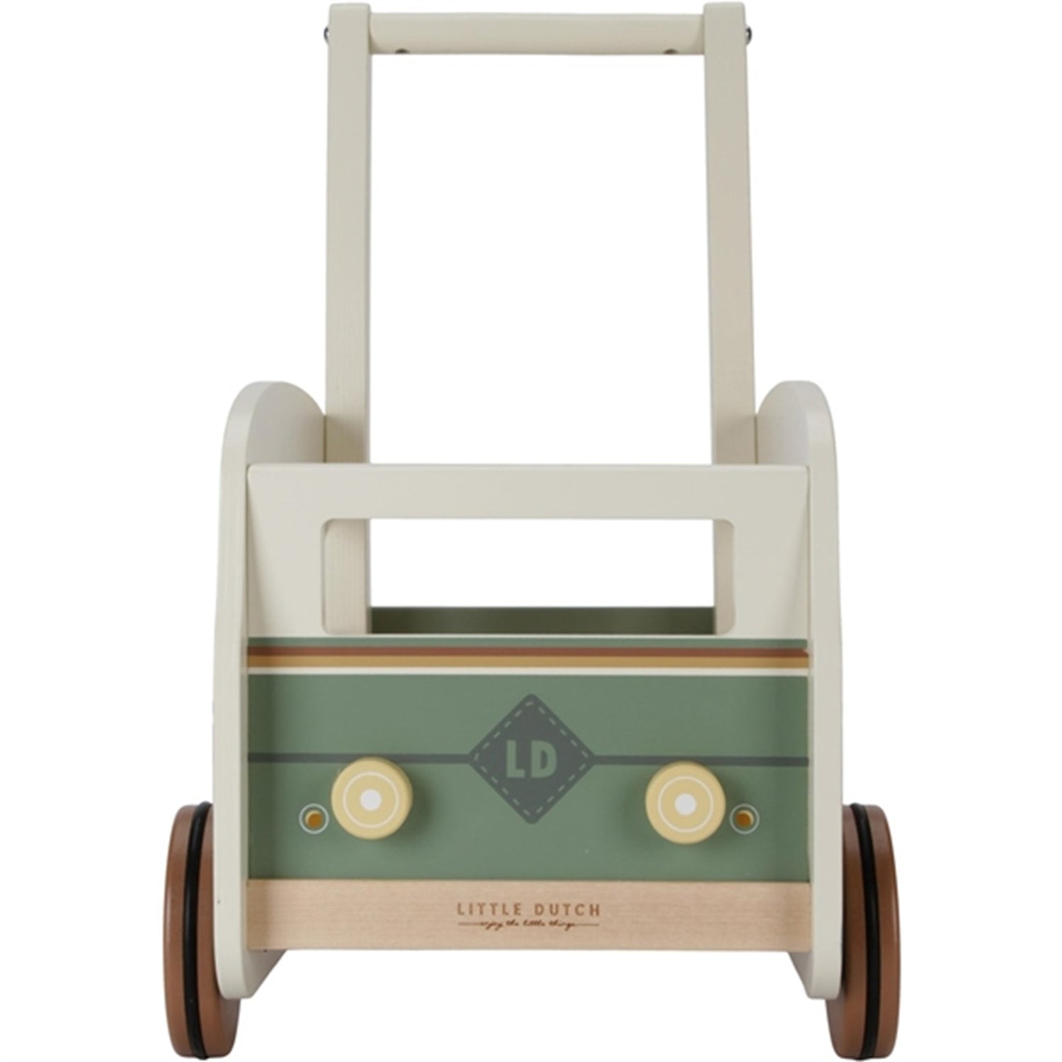 And off you go! On adventure throughout the living room with this Vintage walker wagon. Step by step you learn how to walk, and this push wagon will help you get there. So start your engine and imagine being the driver of this supercool van.The wooden Vintage walker wagon is not just a helper to watch your beginner walker flourish. The timeless design of a vintage surfer van is also the perfect toy box for your baby. Your little one can store toys for imaginative play indoors or bring them with on walking adventures! Great for development of balance, coordination and motor skills. And thanks to the rubber strips you will not have to worry about your floor when your child is cruising through the room.