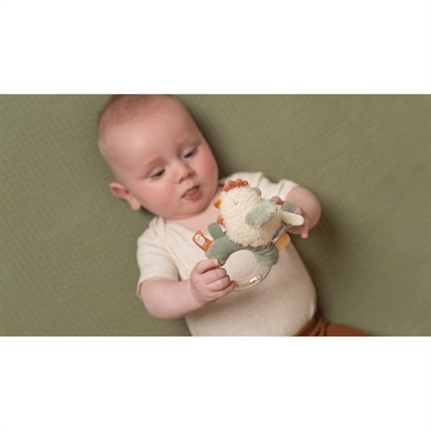 Grab, twist, and shake! This chicken-shaped ring rattle will stimulate your baby's curiosity. Clap the wings or rub the soft belly. The transparent ring is filled with 3 small beads that rattle when your little one plays with it. This attractive baby toy improves hand-eye coordination and stimulates the senses.