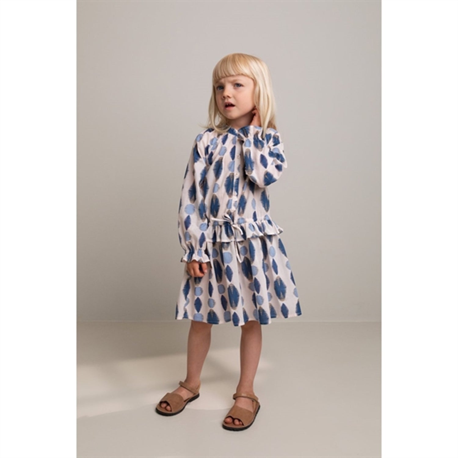 Dress with a loose fit, cute frill details and decorative ribbon. The dress closes with buttons at the front. The length of the dress goes above the knee.