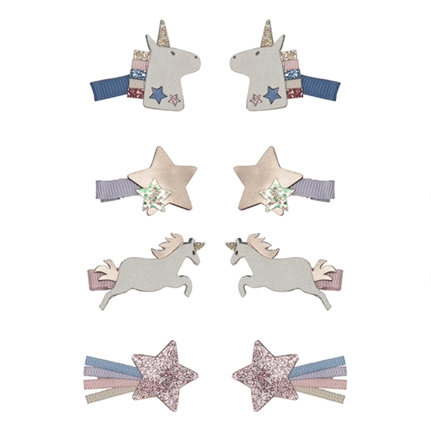 4 pairs of mini hair clips with fairytale unicorns and stars.